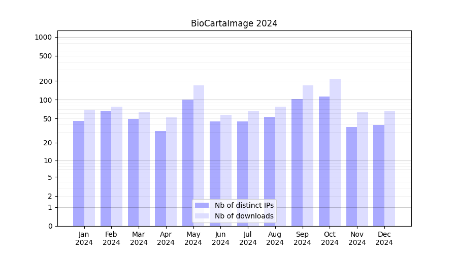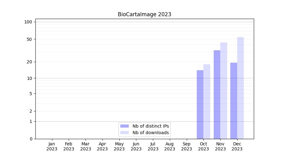 Number of downloads for software package BioCartaImage, year by year, from 2025 back to 2014 (years with no downloads are omitted):