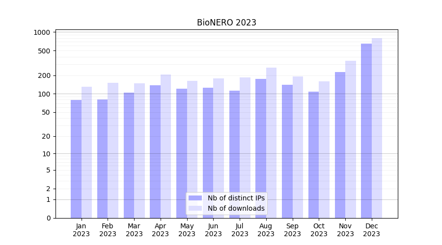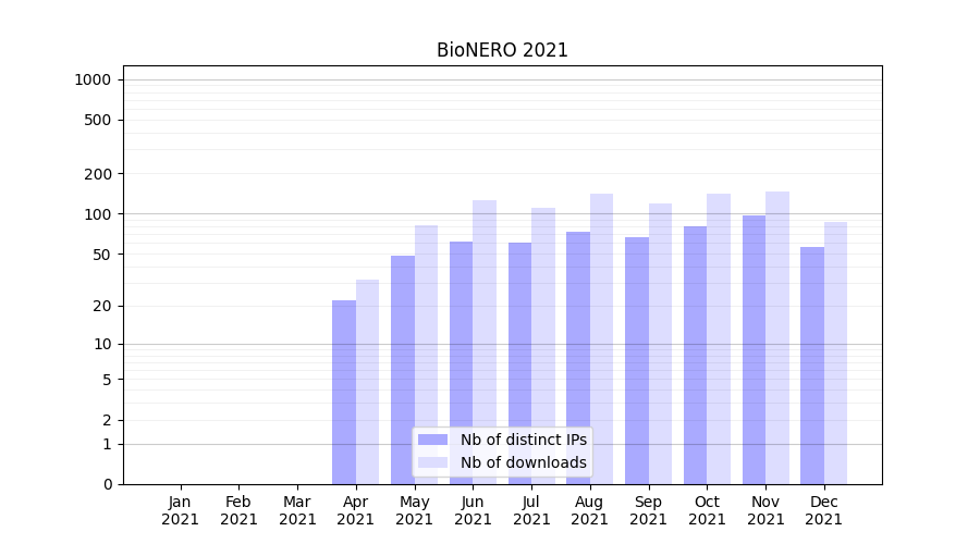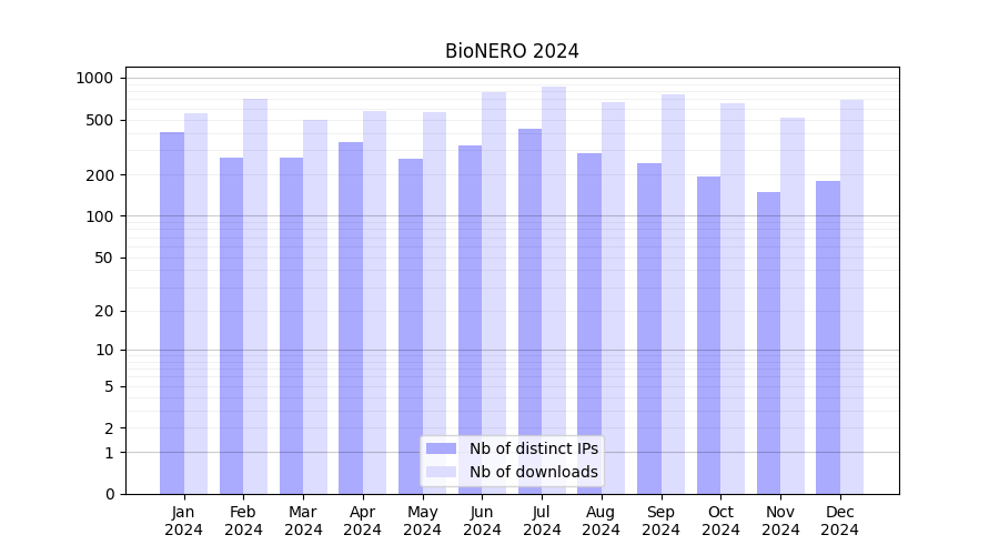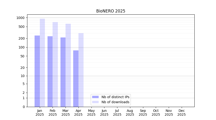 Number of downloads for software package BioNERO, year by year, from 2025 back to 2014 (years with no downloads are omitted):