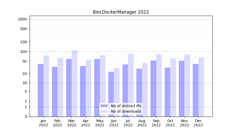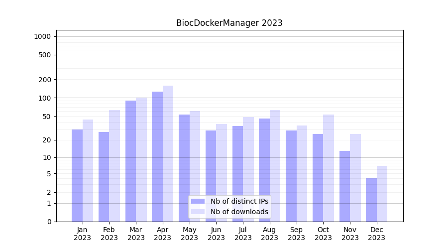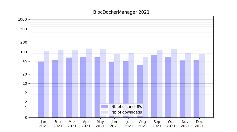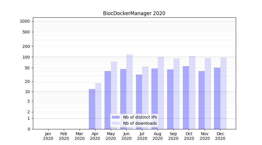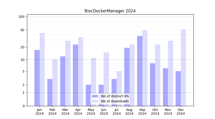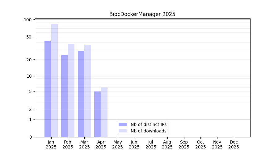 Number of downloads for software package BiocDockerManager, year by year, from 2025 back to 2014 (years with no downloads are omitted):