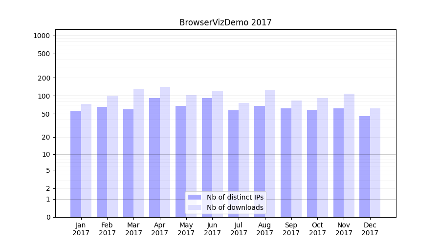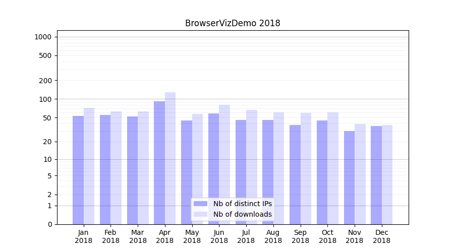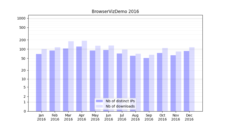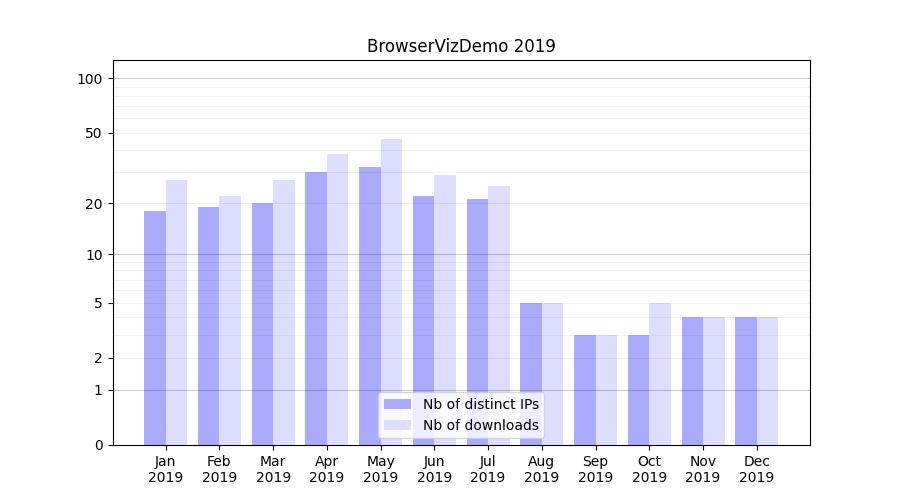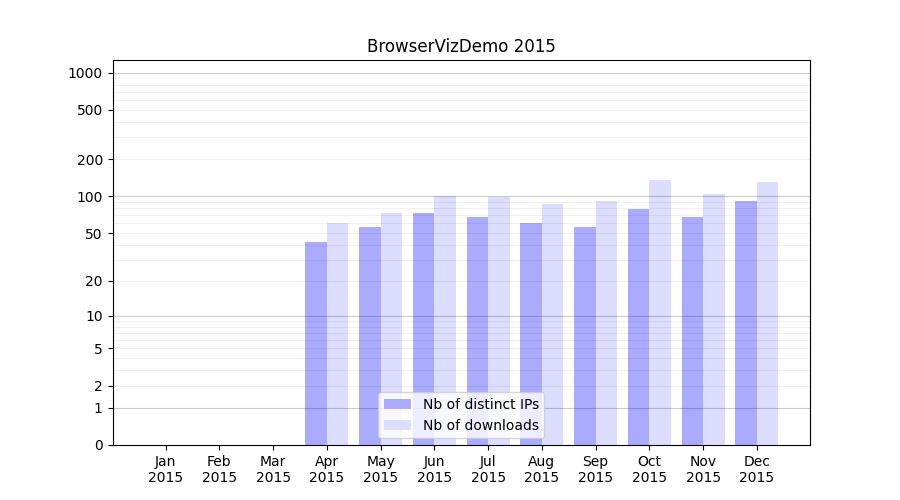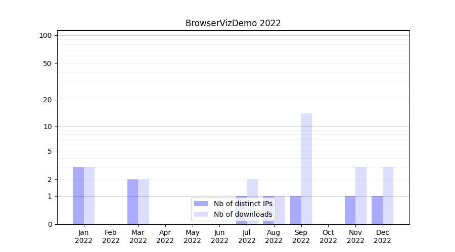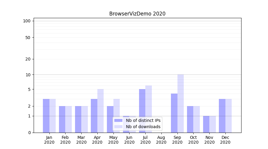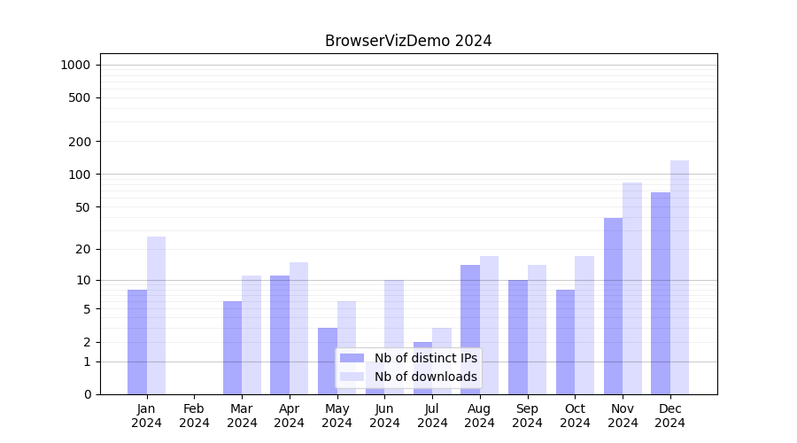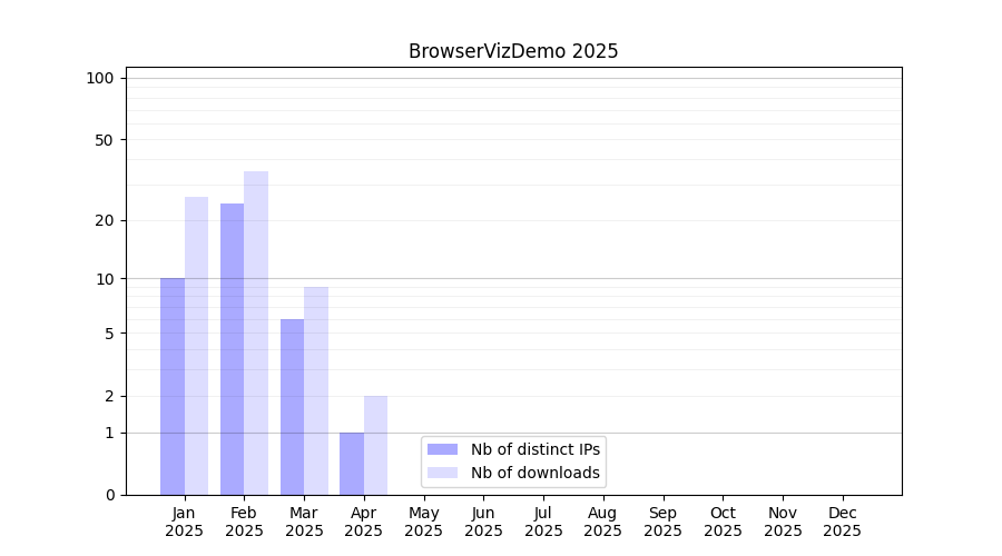 Number of downloads for software package BrowserVizDemo, year by year, from 2025 back to 2014 (years with no downloads are omitted):