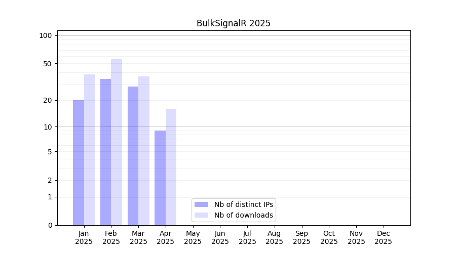 Number of downloads for software package BulkSignalR, year by year, from 2025 back to 2014 (years with no downloads are omitted):