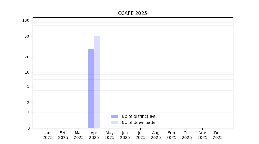 Number of downloads for software package CCAFE, year by year, from 2025 back to 2014 (years with no downloads are omitted):