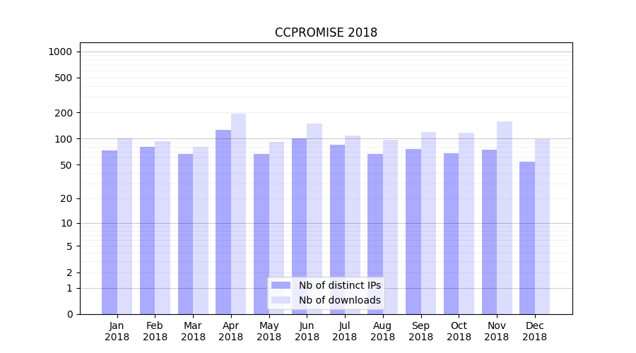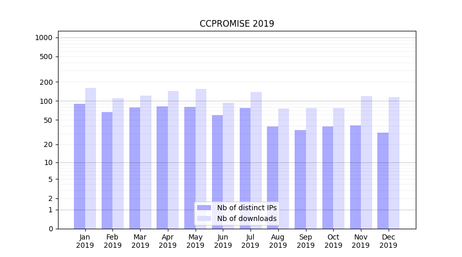 Number of downloads for software package CCPROMISE, year by year, from 2025 back to 2014 (years with no downloads are omitted):