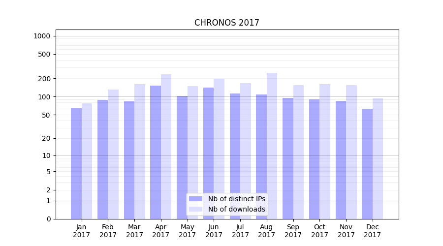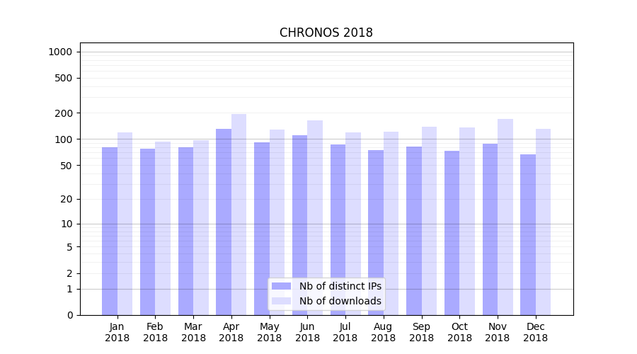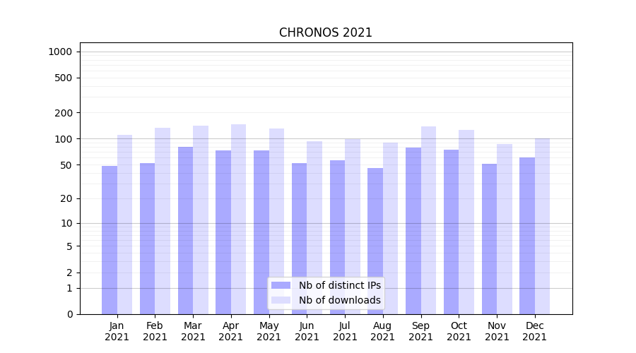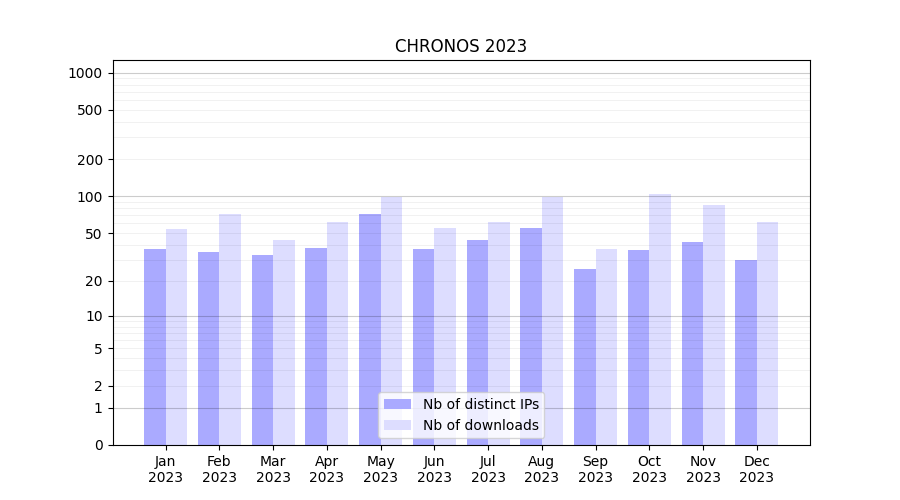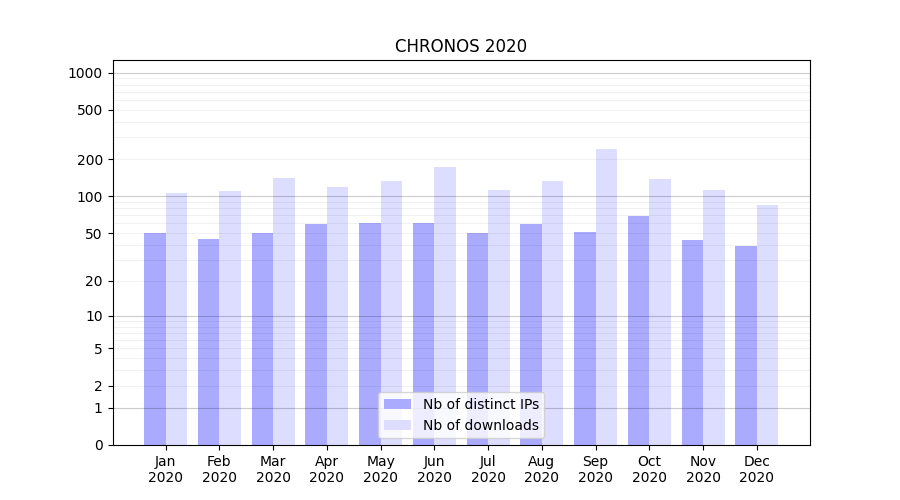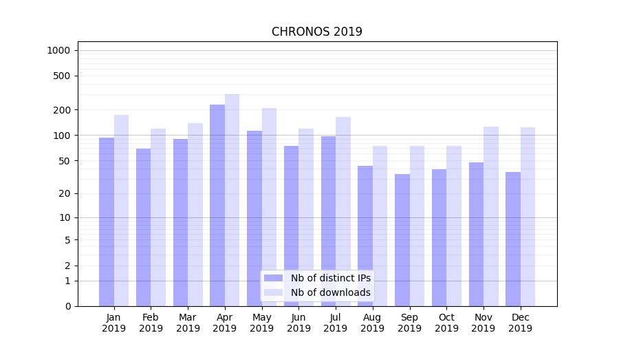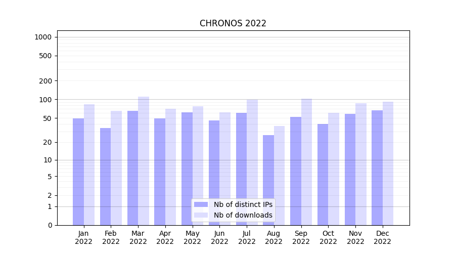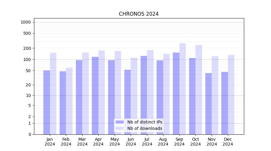Number of downloads for software package CHRONOS, year by year, from 2025 back to 2014 (years with no downloads are omitted):