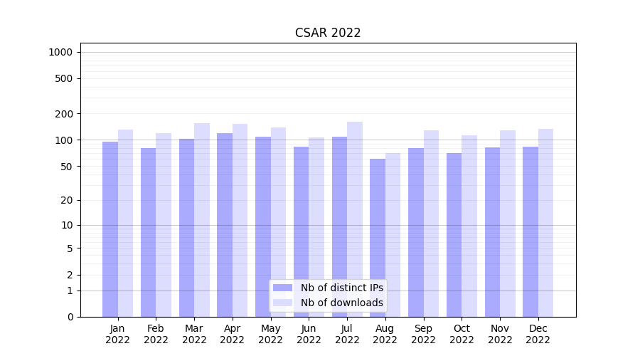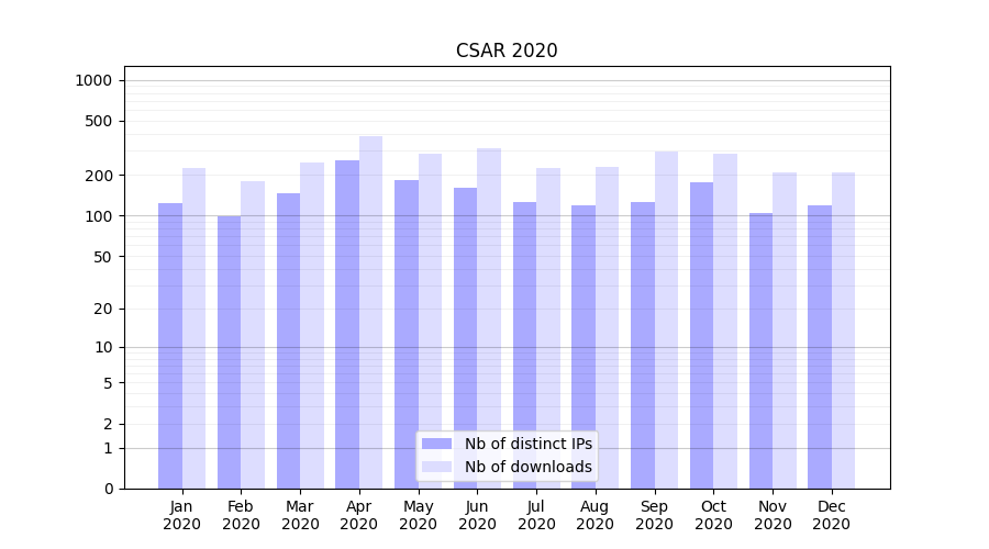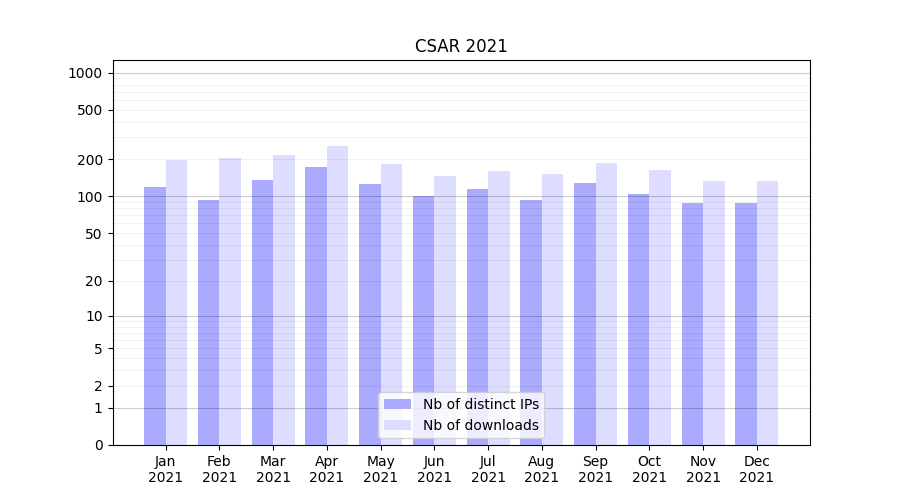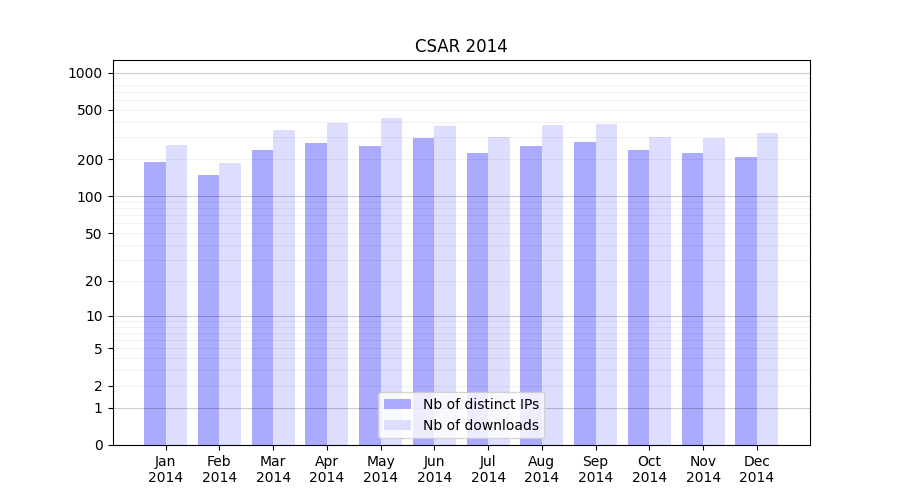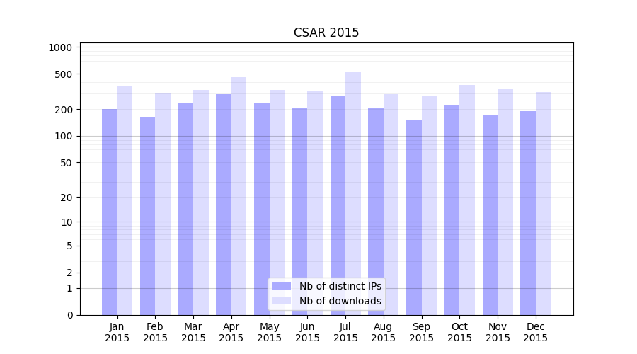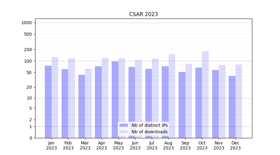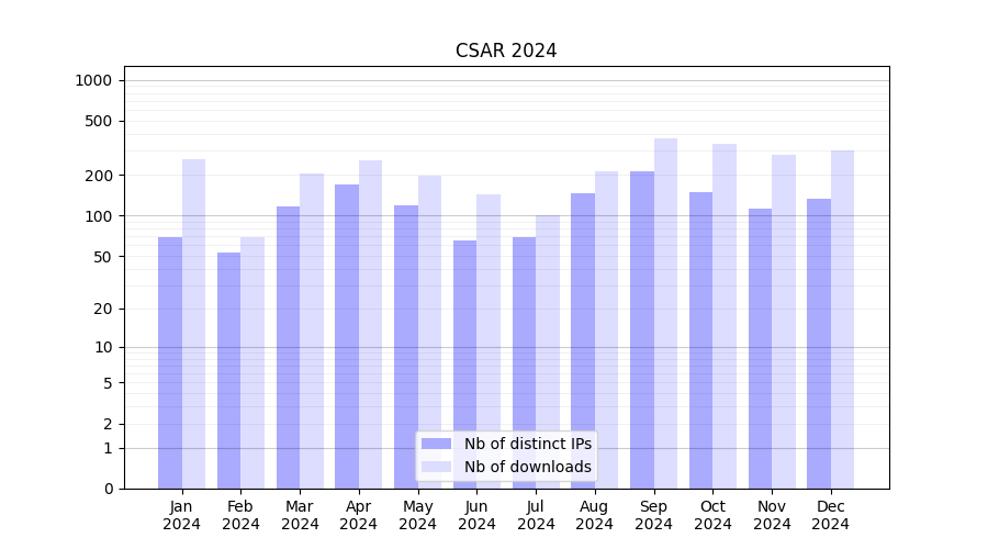 Number of downloads for software package CSAR, year by year, from 2025 back to 2014 (years with no downloads are omitted):