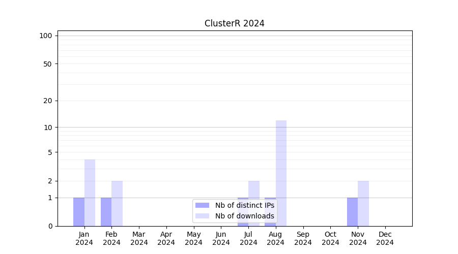 Number of downloads for software package ClusterR, year by year, from 2025 back to 2014 (years with no downloads are omitted):