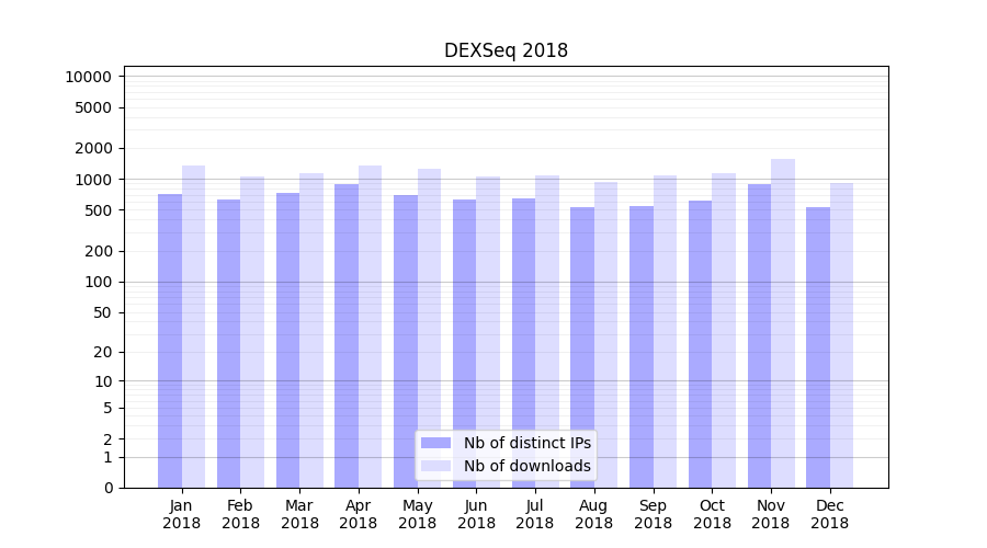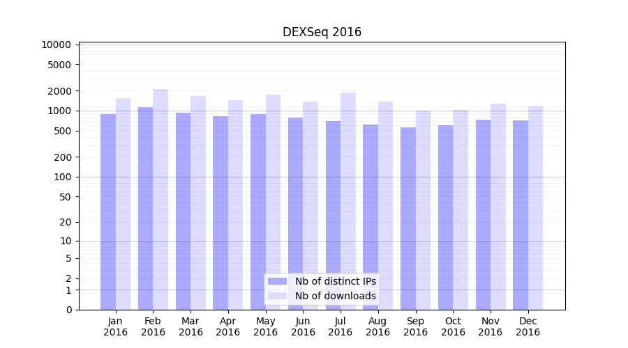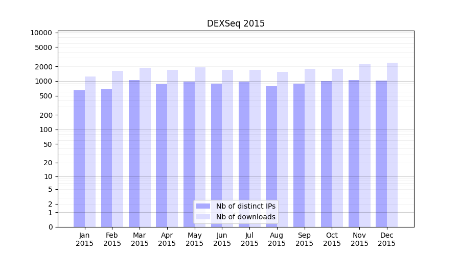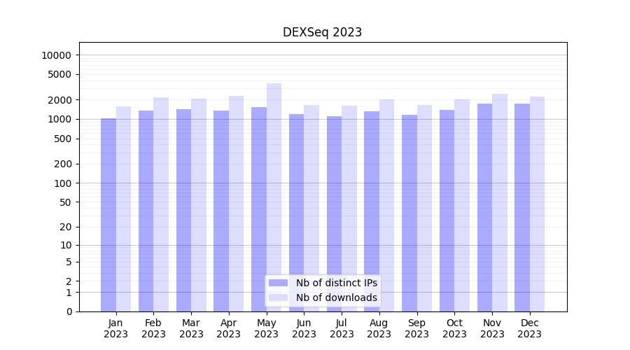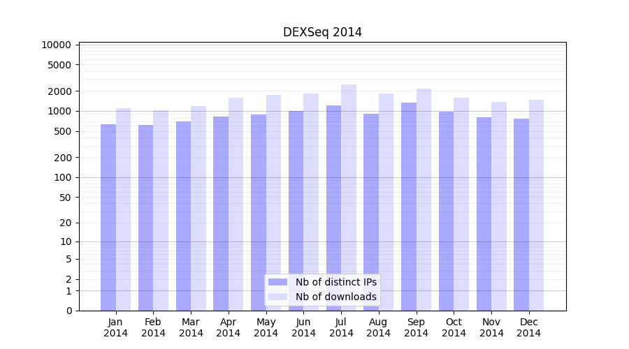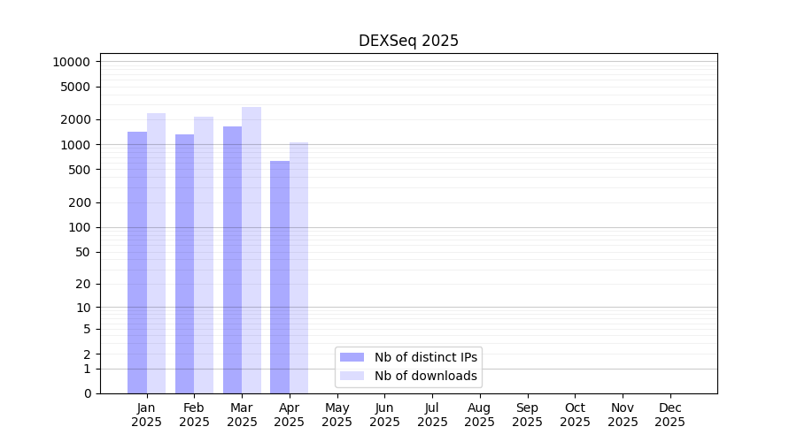 Number of downloads for software package DEXSeq, year by year, from 2025 back to 2014 (years with no downloads are omitted):