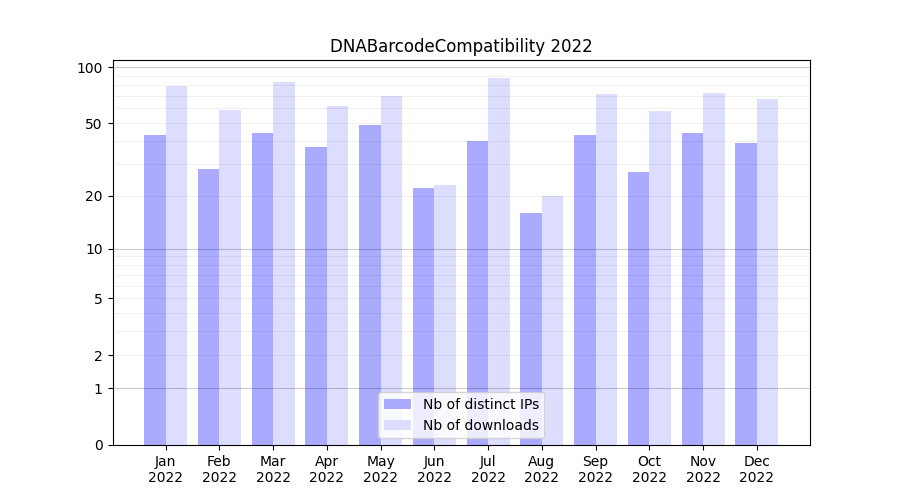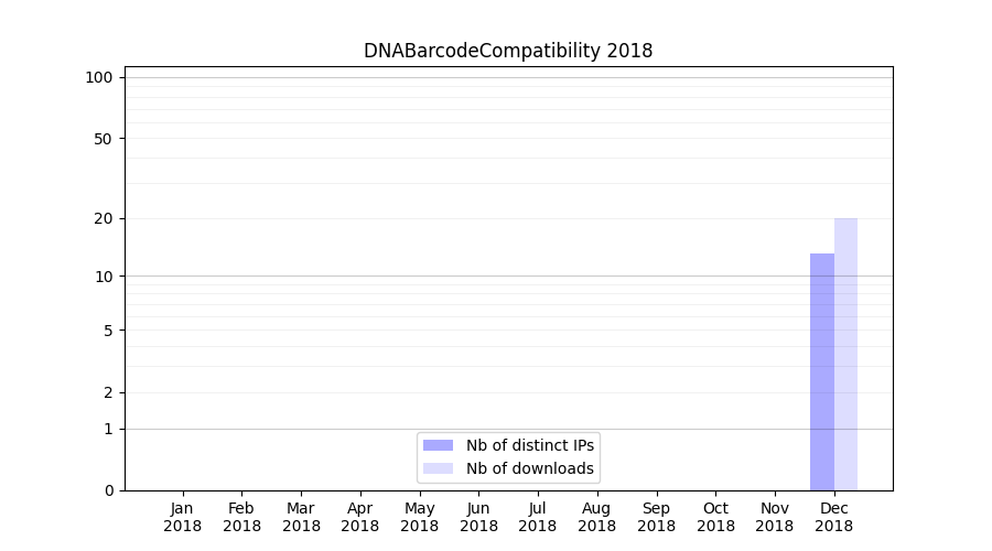 Number of downloads for software package DNABarcodeCompatibility, year by year, from 2025 back to 2014 (years with no downloads are omitted):