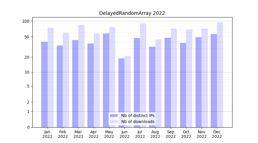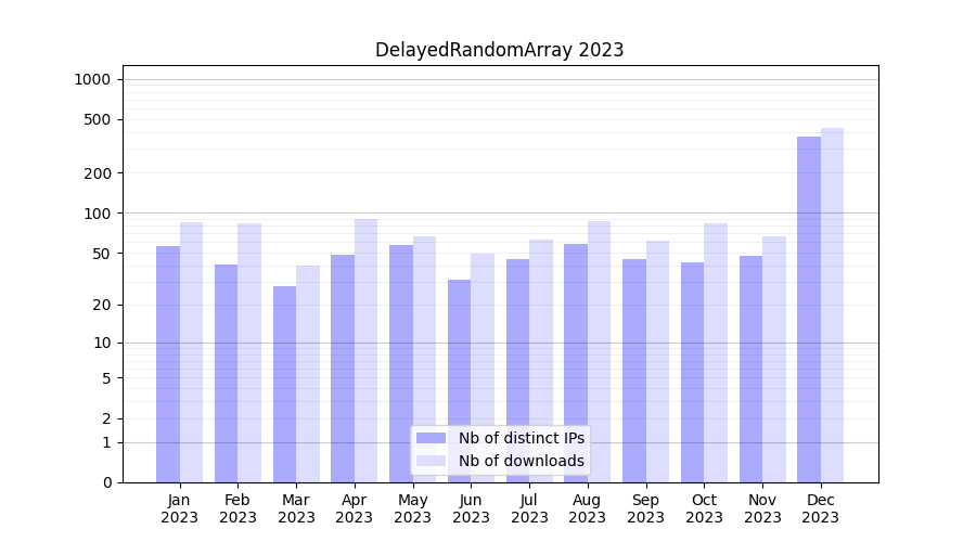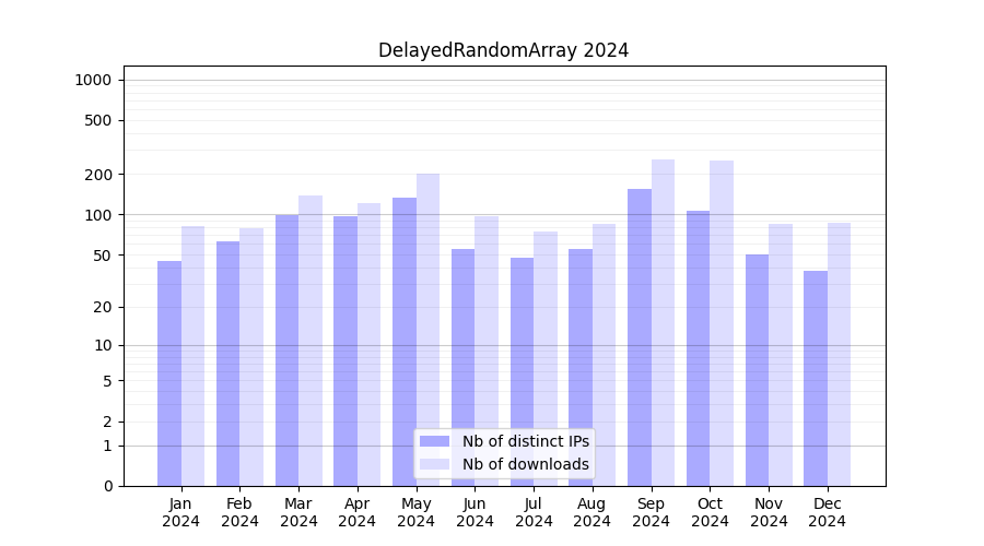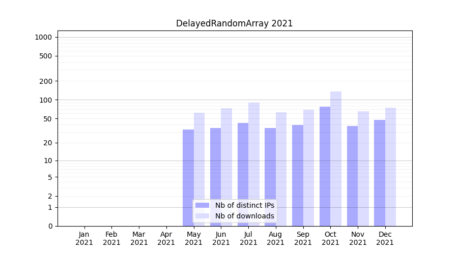 Number of downloads for software package DelayedRandomArray, year by year, from 2025 back to 2014 (years with no downloads are omitted):
