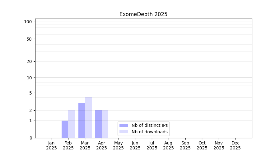 Number of downloads for software package ExomeDepth, year by year, from 2025 back to 2014 (years with no downloads are omitted):