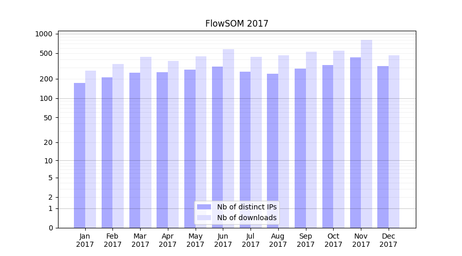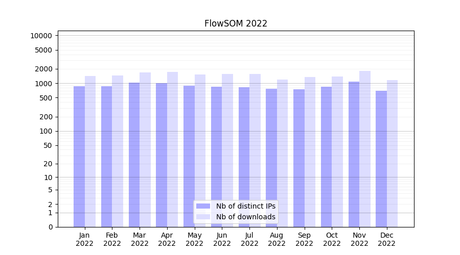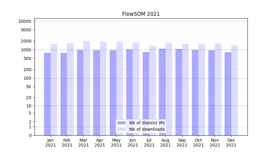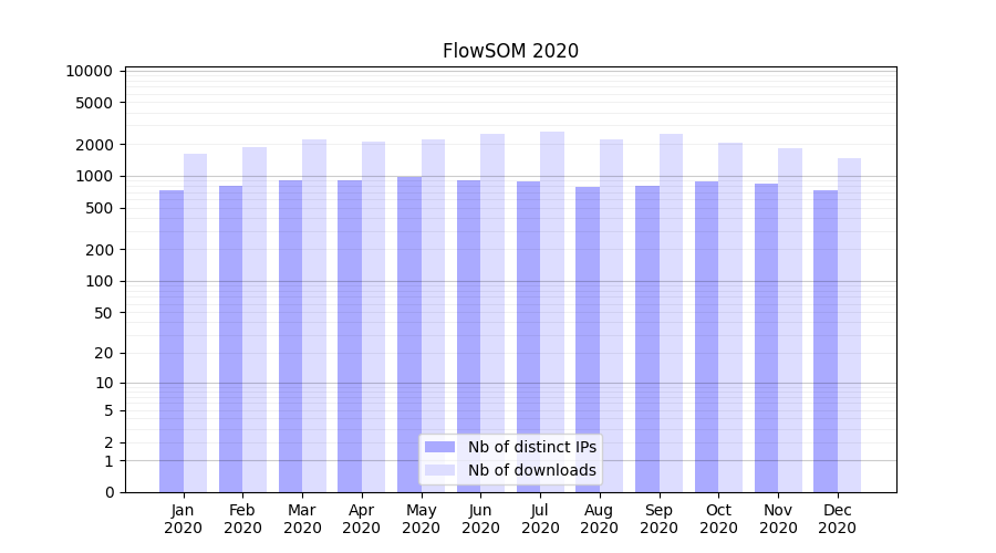 Number of downloads for software package FlowSOM, year by year, from 2025 back to 2014 (years with no downloads are omitted):