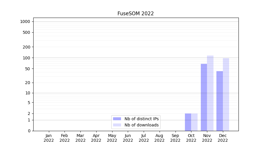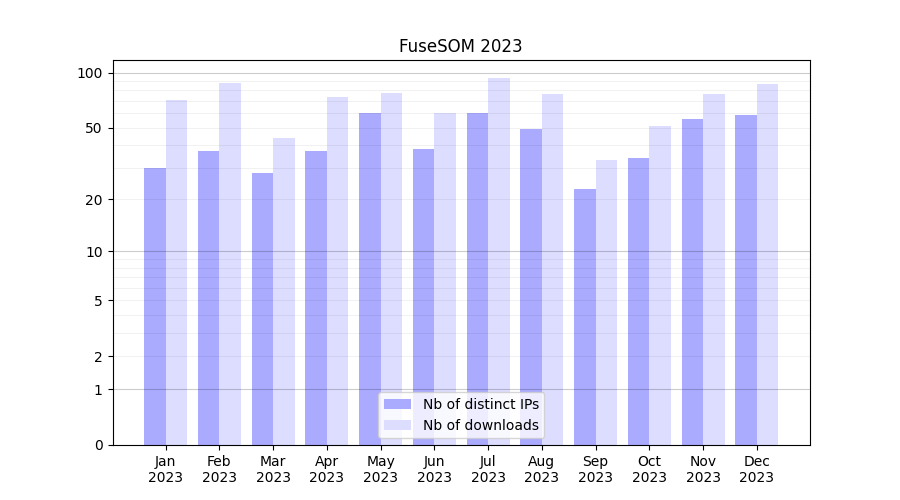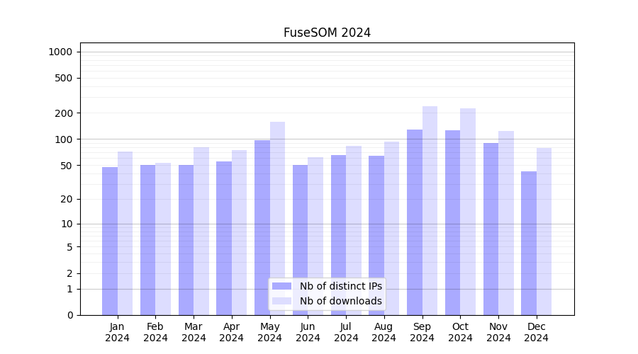 Number of downloads for software package FuseSOM, year by year, from 2025 back to 2014 (years with no downloads are omitted):