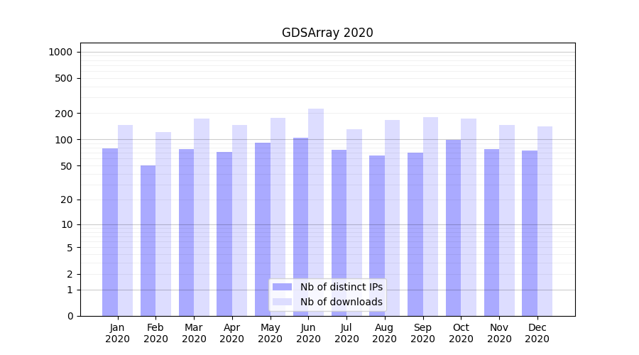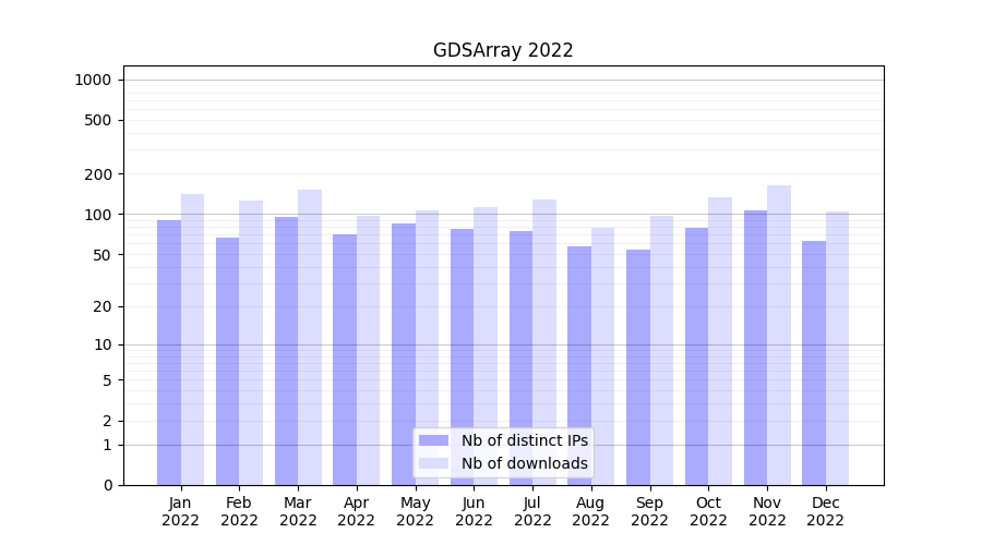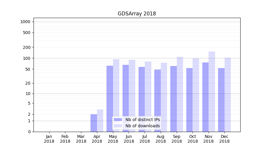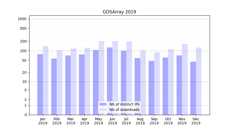 Number of downloads for software package GDSArray, year by year, from 2025 back to 2014 (years with no downloads are omitted):