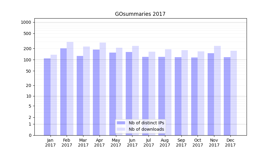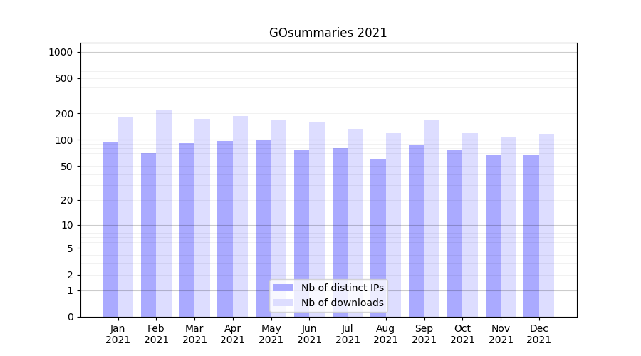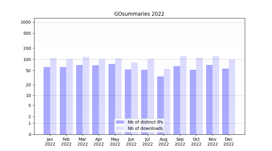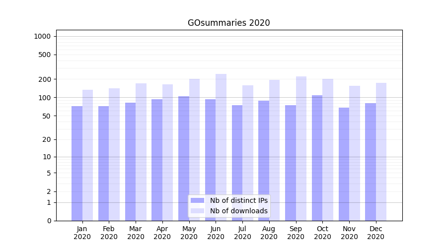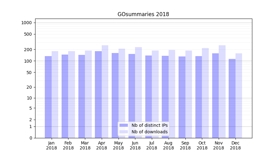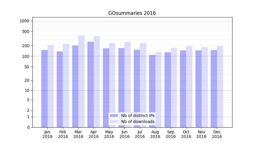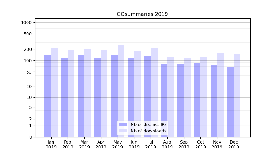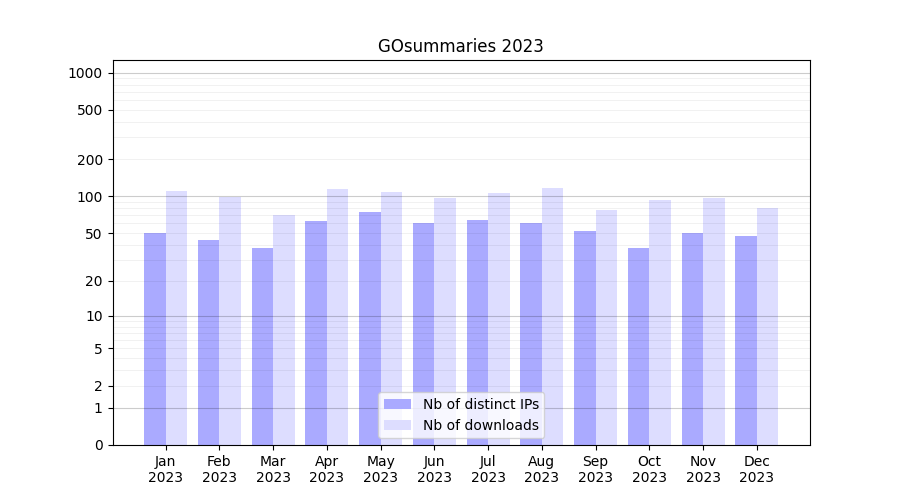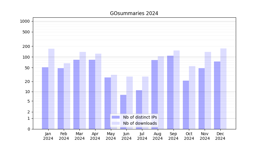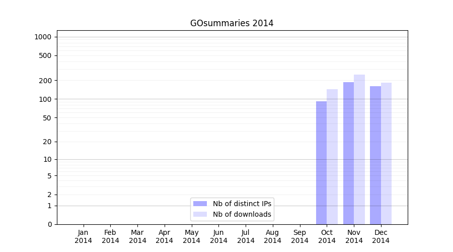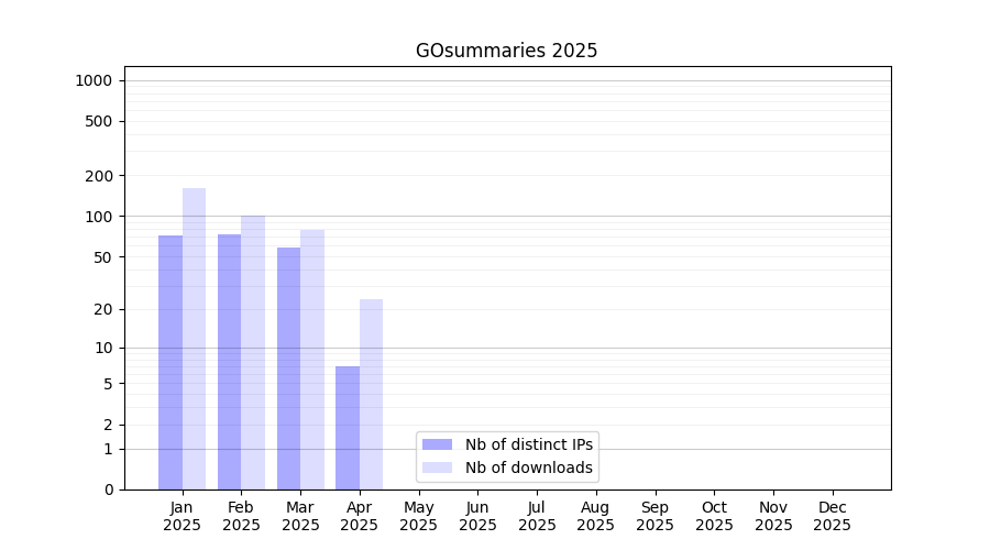 Number of downloads for software package GOsummaries, year by year, from 2025 back to 2014 (years with no downloads are omitted):