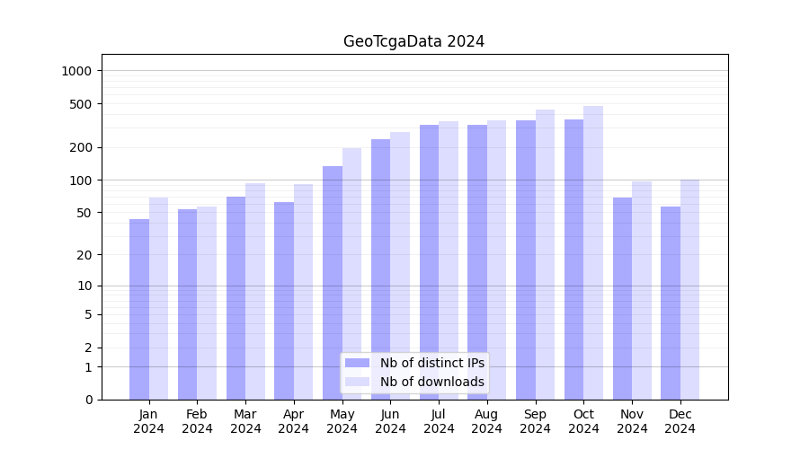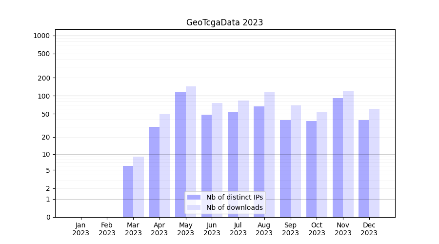 Number of downloads for software package GeoTcgaData, year by year, from 2025 back to 2014 (years with no downloads are omitted):