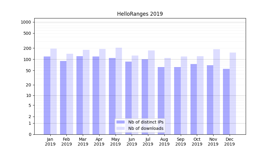 Number of downloads for software package HelloRanges, year by year, from 2025 back to 2014 (years with no downloads are omitted):