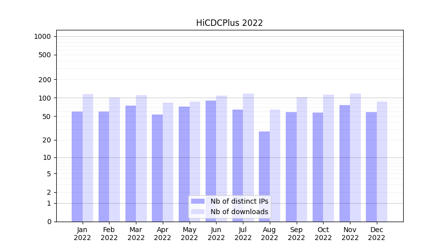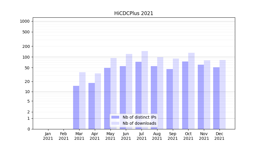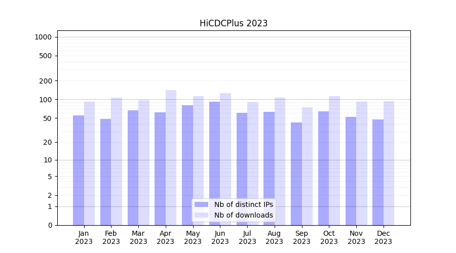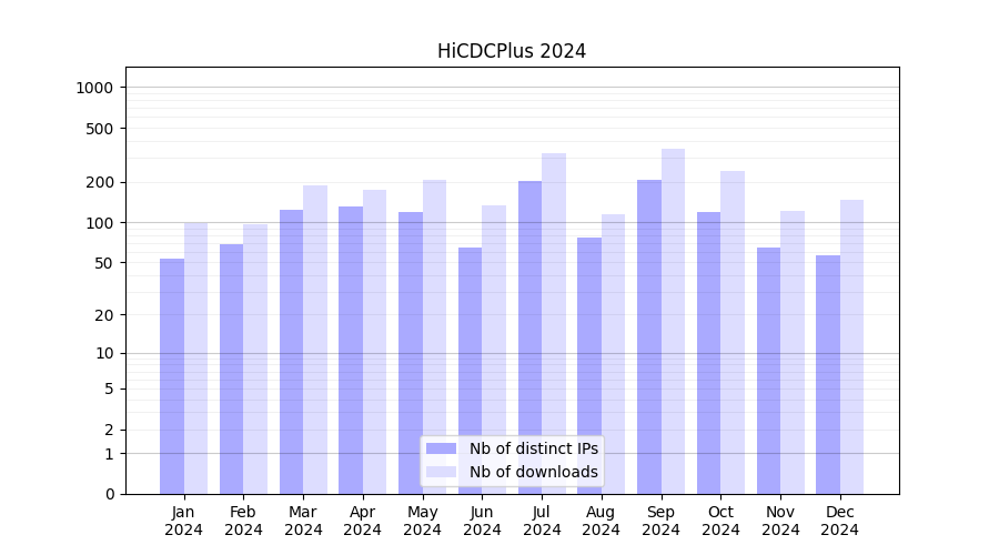 Number of downloads for software package HiCDCPlus, year by year, from 2025 back to 2014 (years with no downloads are omitted):