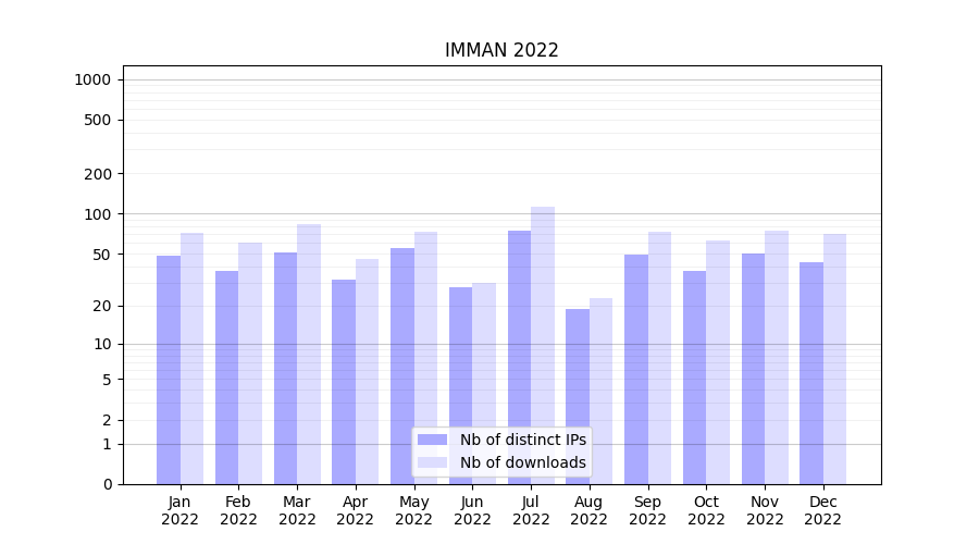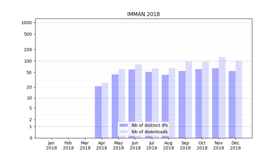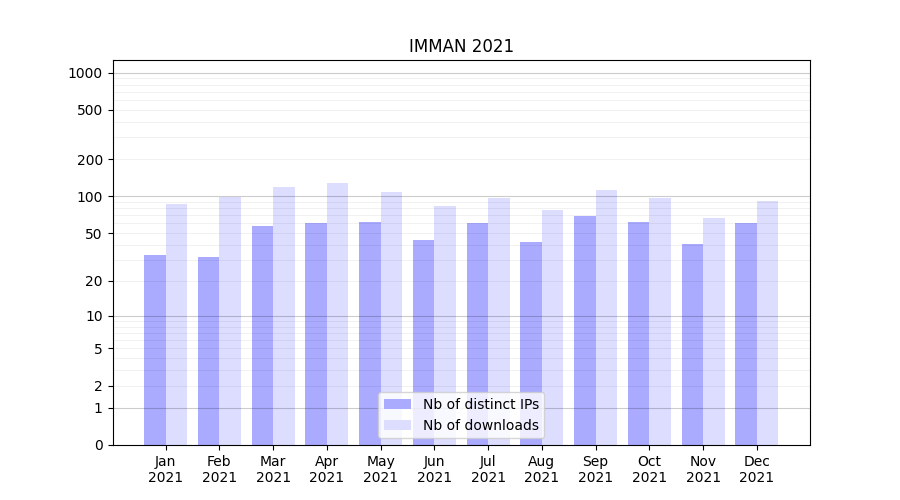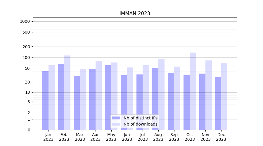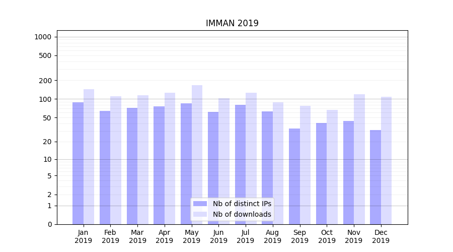 Number of downloads for software package IMMAN, year by year, from 2025 back to 2014 (years with no downloads are omitted):
