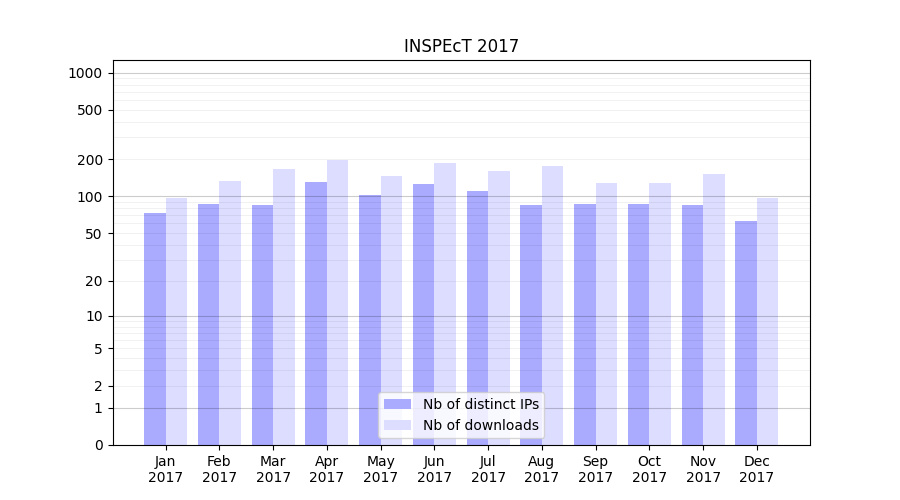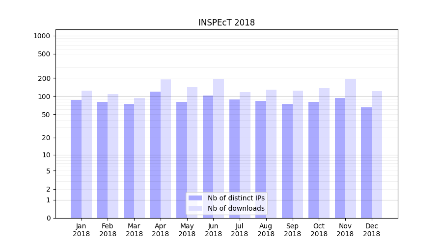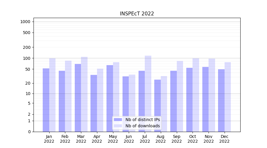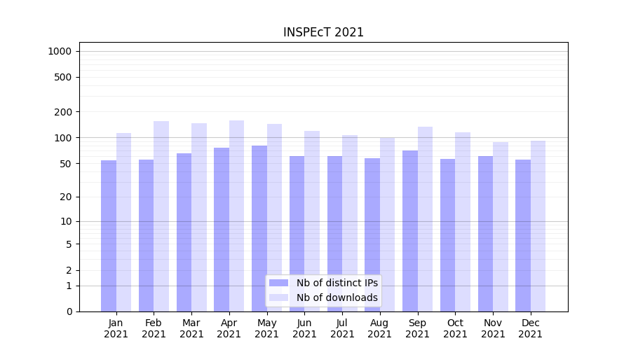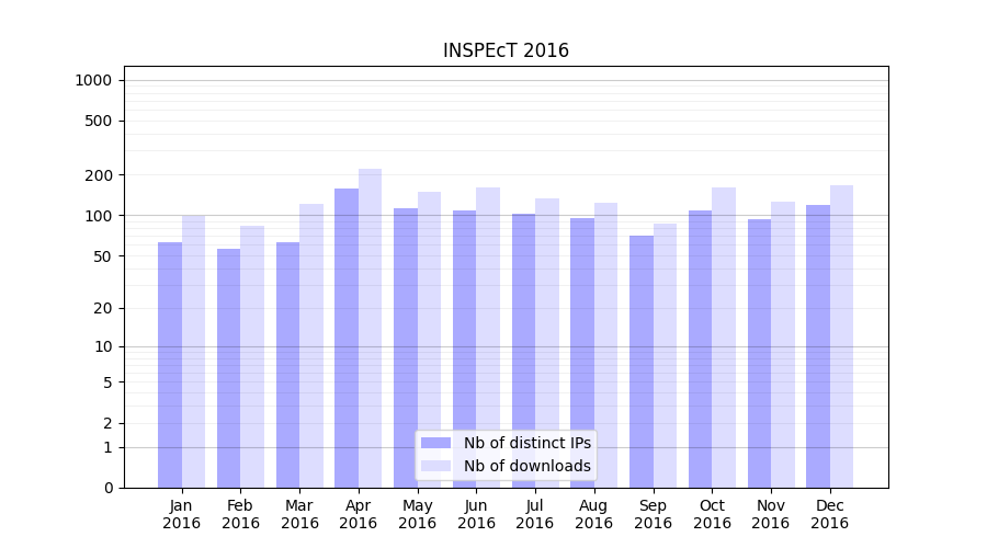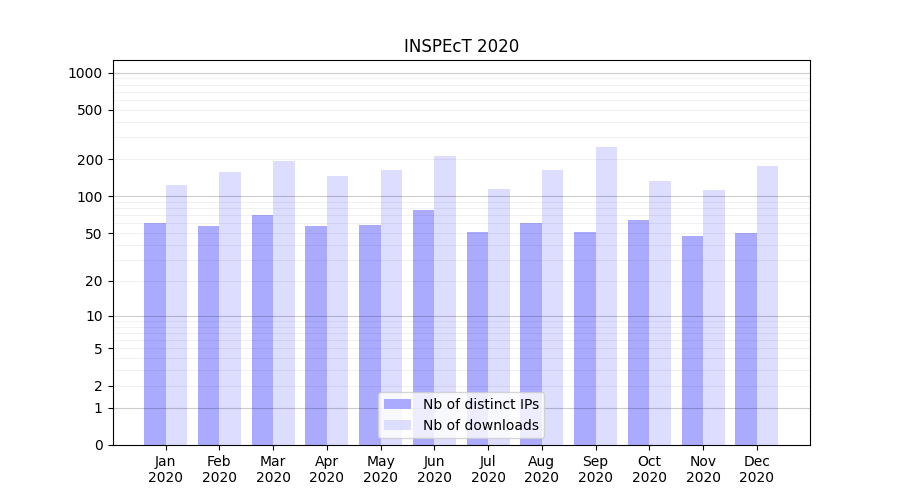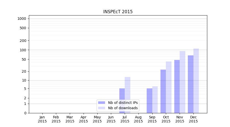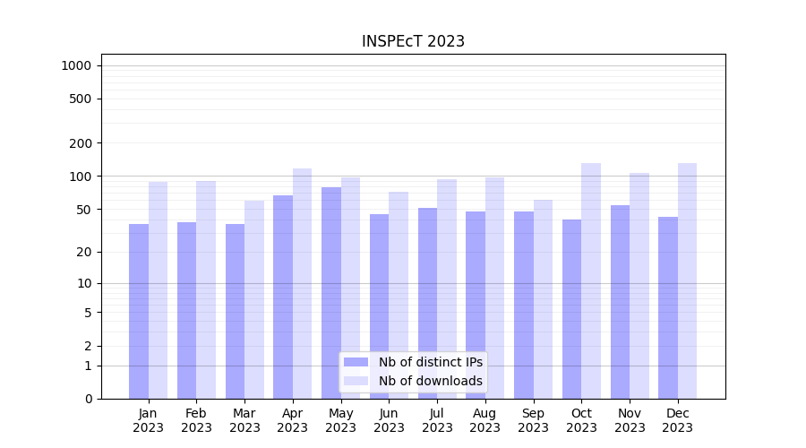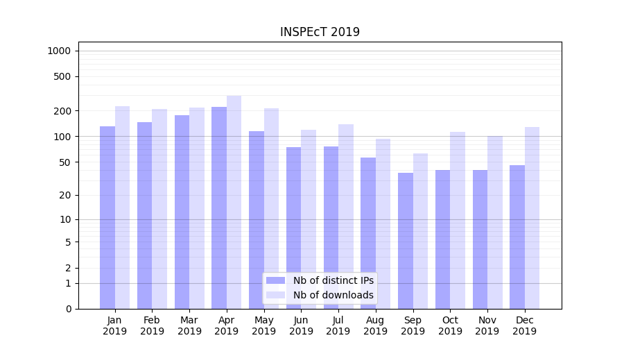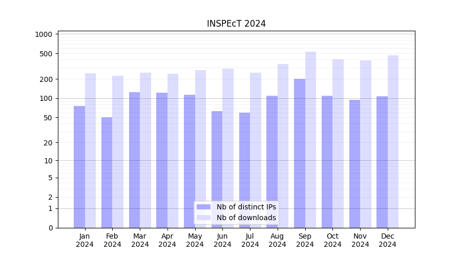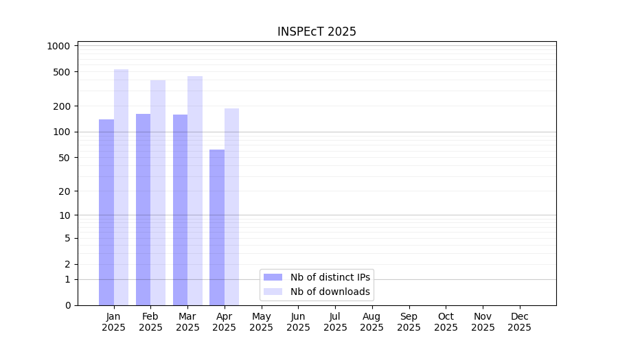 Number of downloads for software package INSPEcT, year by year, from 2025 back to 2014 (years with no downloads are omitted):