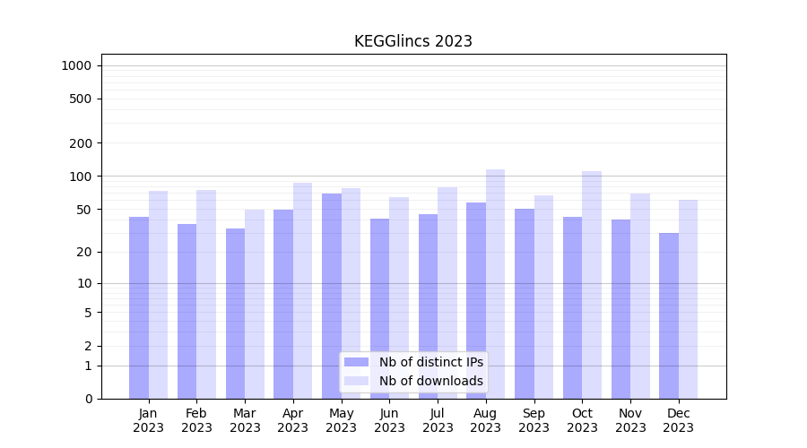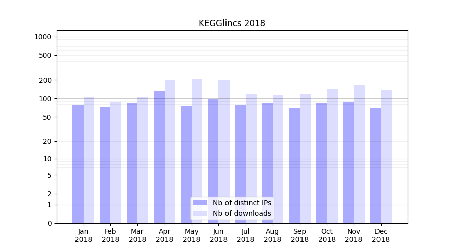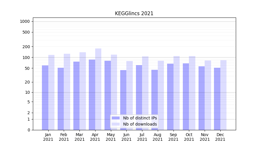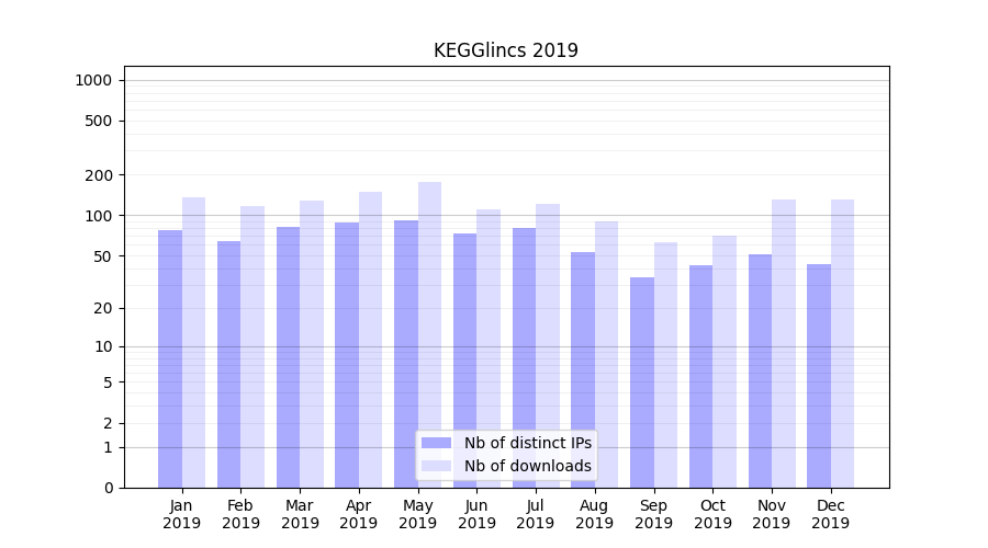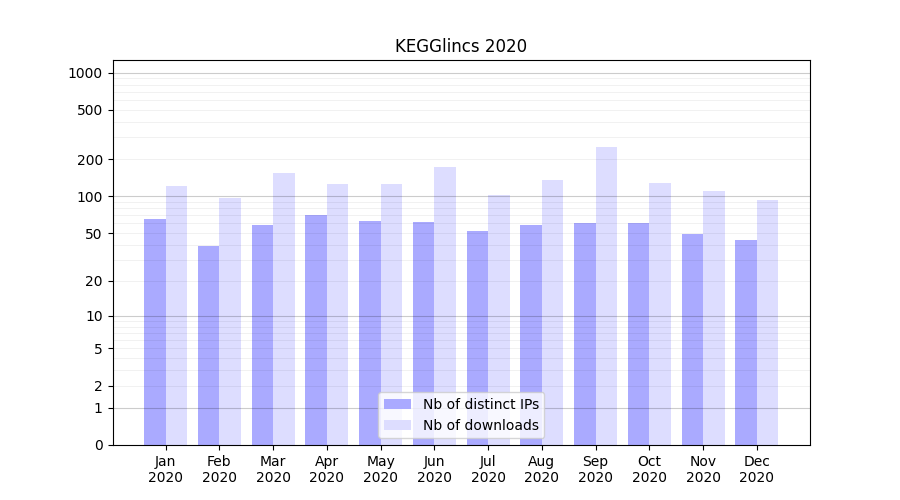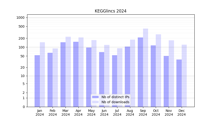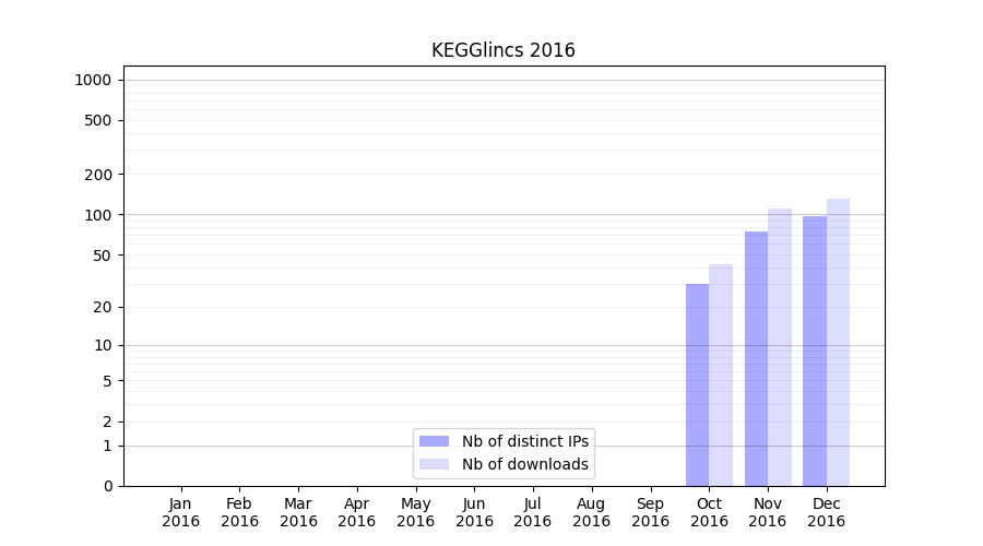 Number of downloads for software package KEGGlincs, year by year, from 2025 back to 2014 (years with no downloads are omitted):