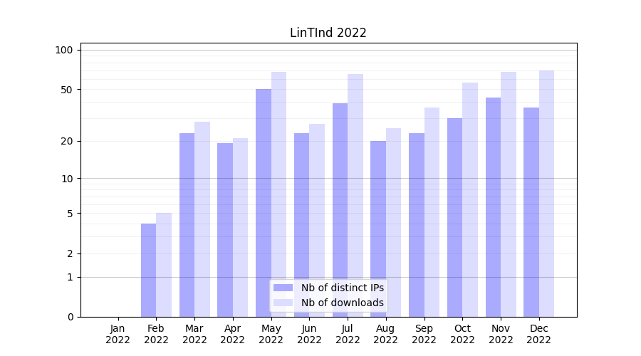 Number of downloads for software package LinTInd, year by year, from 2025 back to 2014 (years with no downloads are omitted):