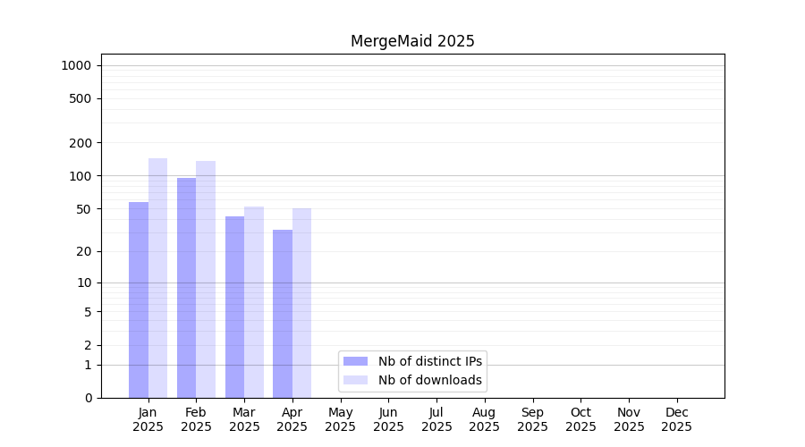 Number of downloads for software package MergeMaid, year by year, from 2025 back to 2014 (years with no downloads are omitted):