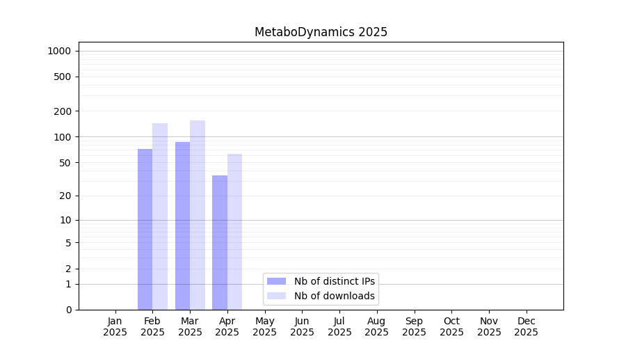 Number of downloads for software package MetaboDynamics, year by year, from 2025 back to 2014 (years with no downloads are omitted):