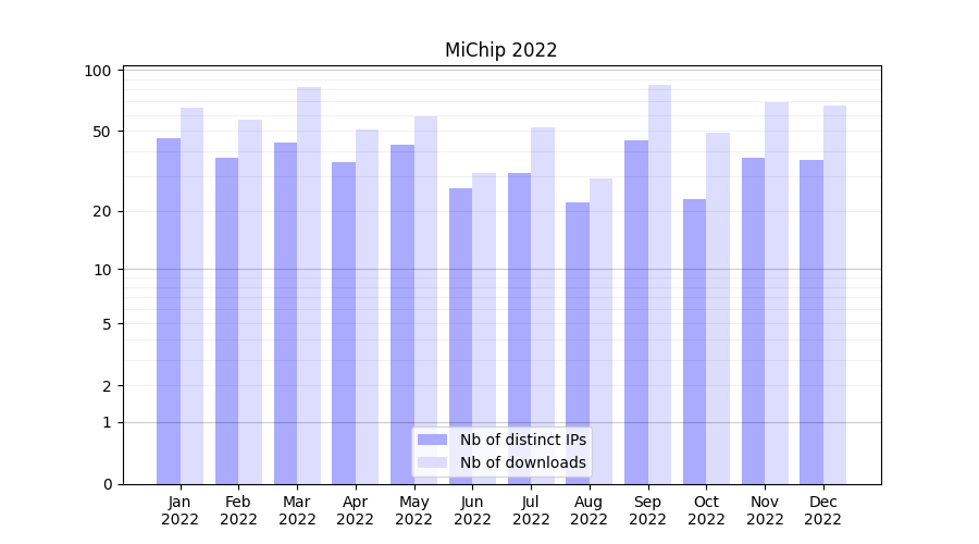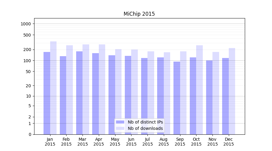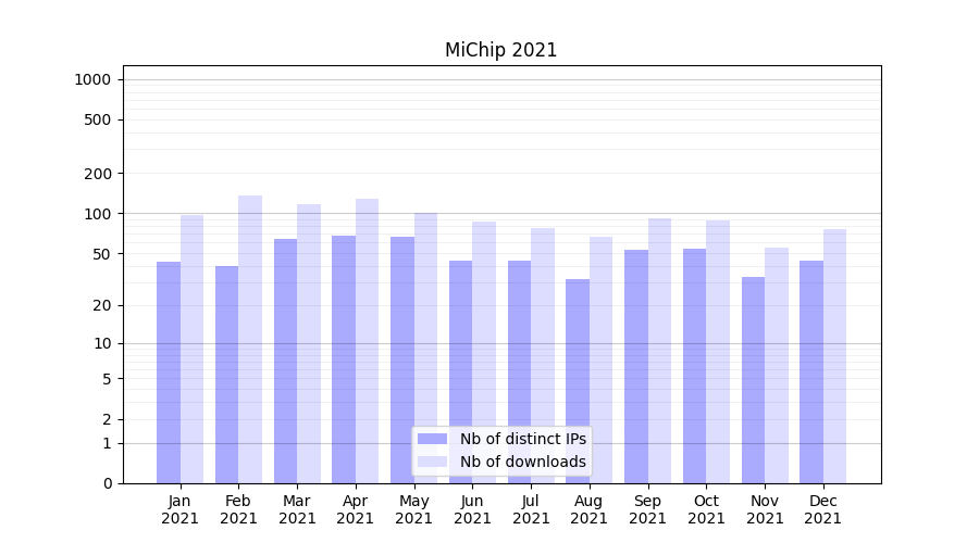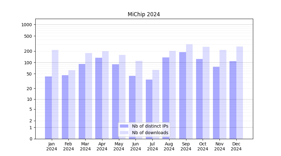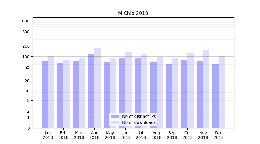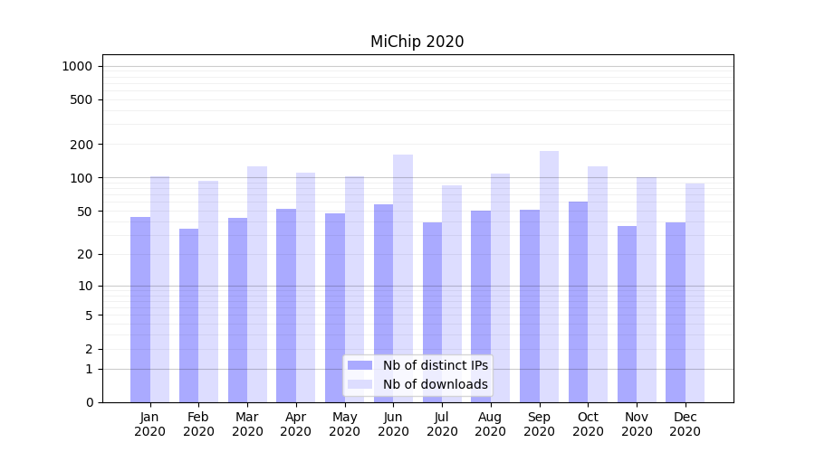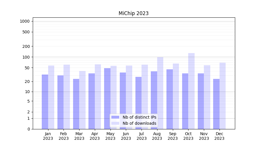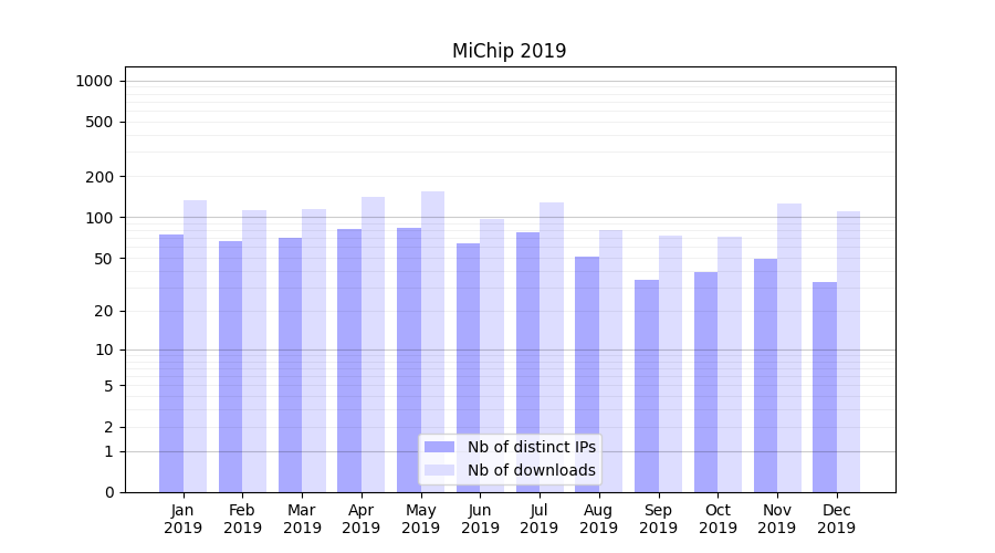 Number of downloads for software package MiChip, year by year, from 2025 back to 2014 (years with no downloads are omitted):