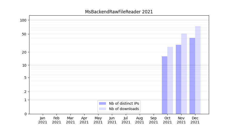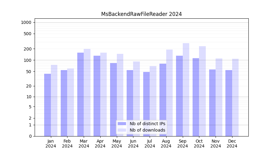 Number of downloads for software package MsBackendRawFileReader, year by year, from 2025 back to 2014 (years with no downloads are omitted):
