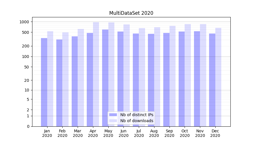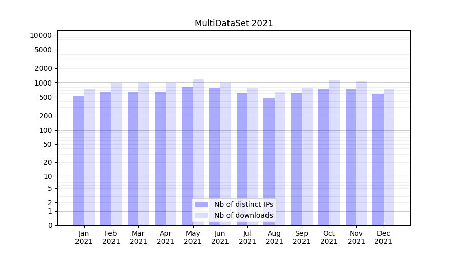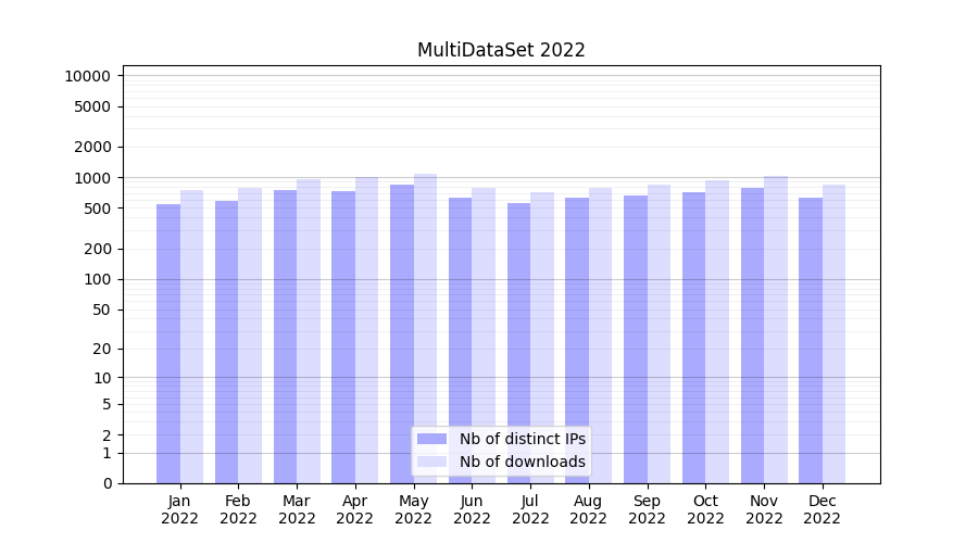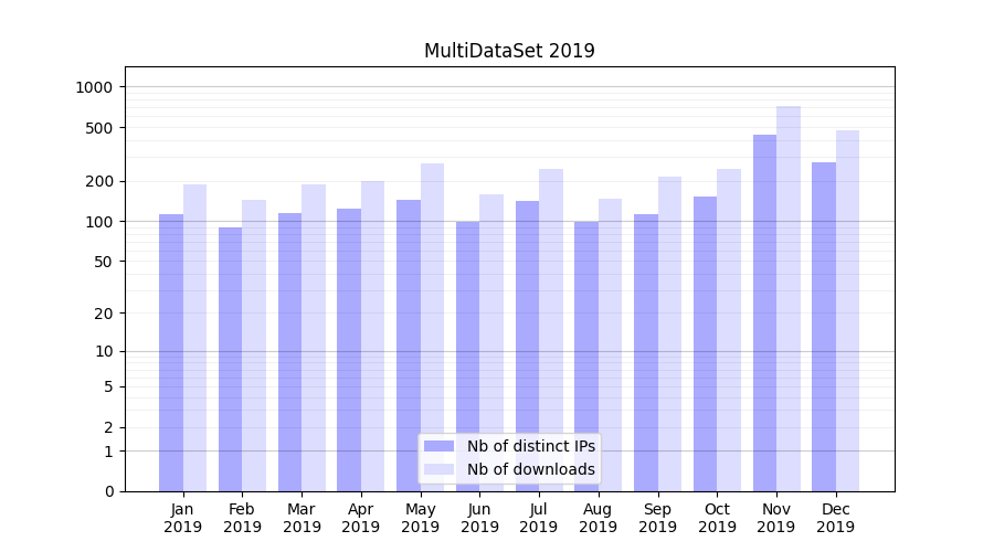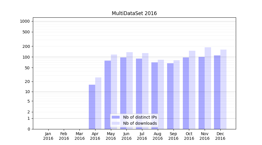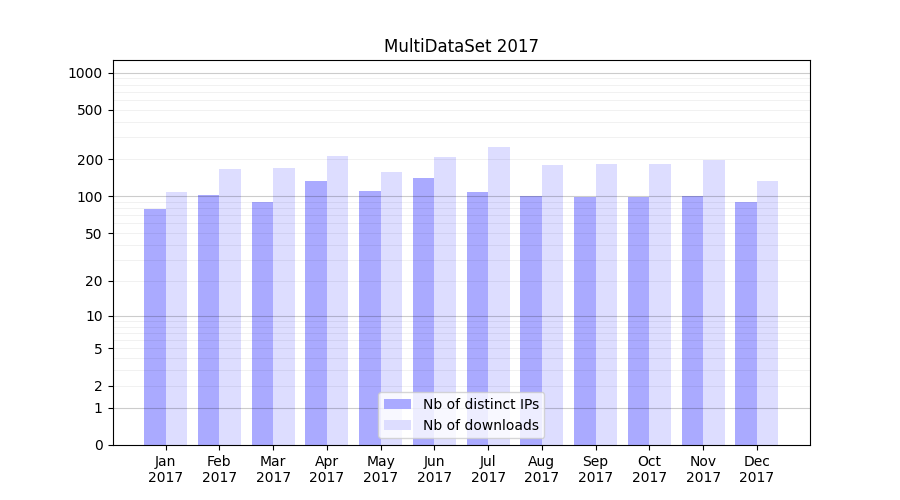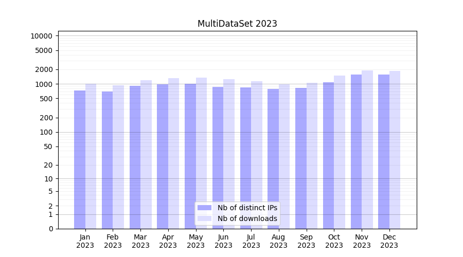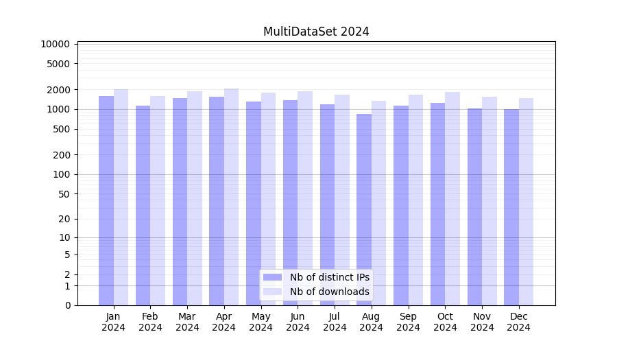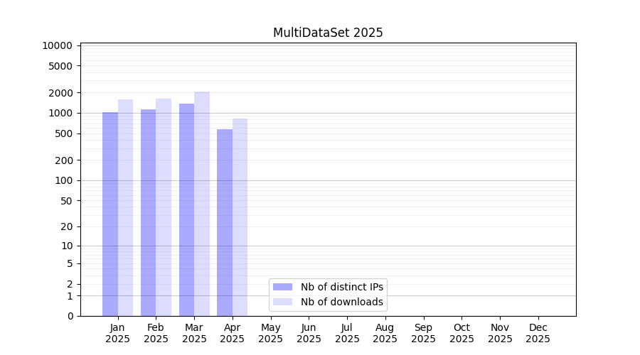 Number of downloads for software package MultiDataSet, year by year, from 2025 back to 2014 (years with no downloads are omitted):