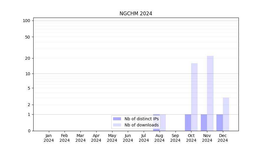 Number of downloads for software package NGCHM, year by year, from 2025 back to 2014 (years with no downloads are omitted):