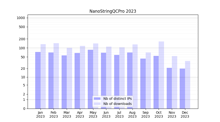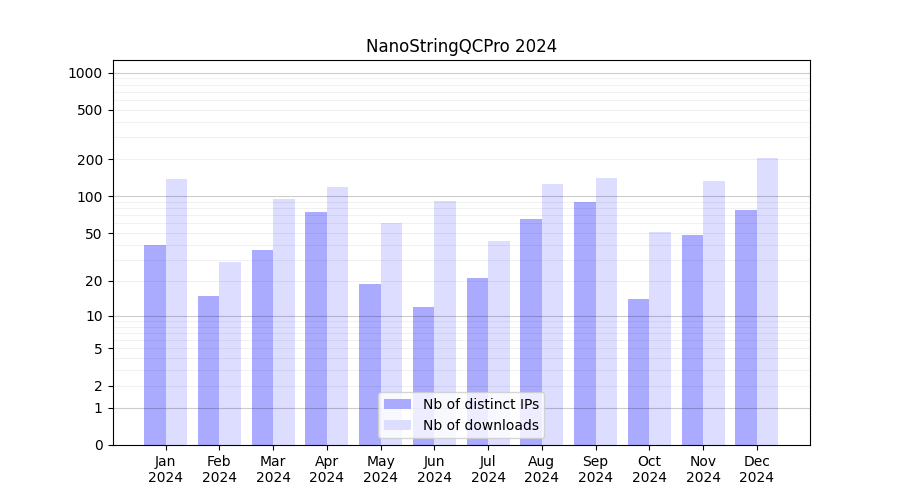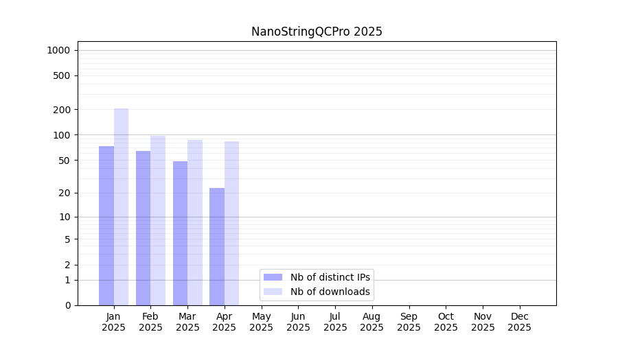 Number of downloads for software package NanoStringQCPro, year by year, from 2025 back to 2014 (years with no downloads are omitted):