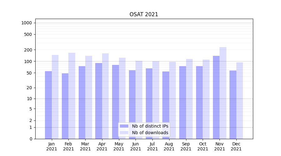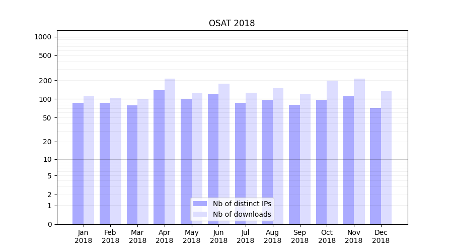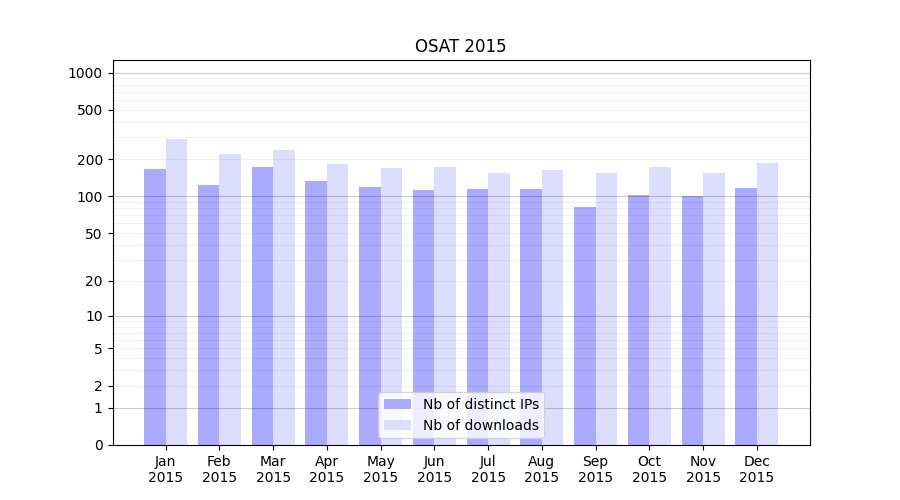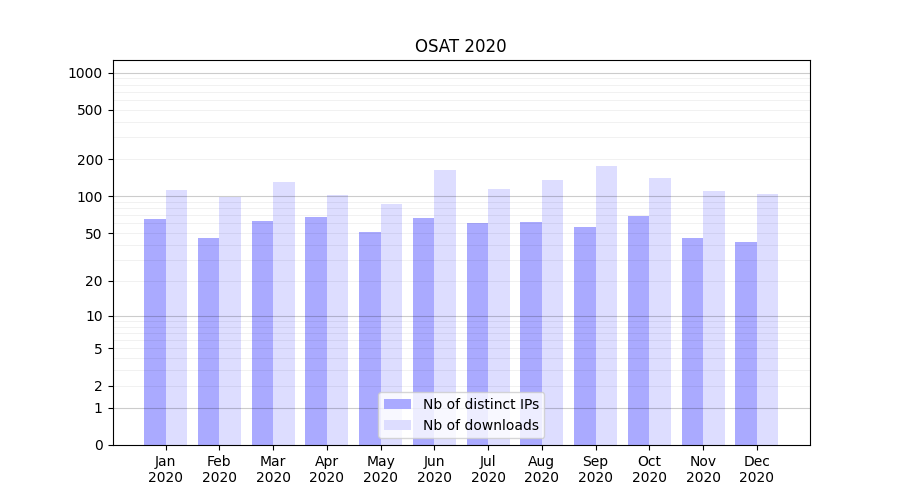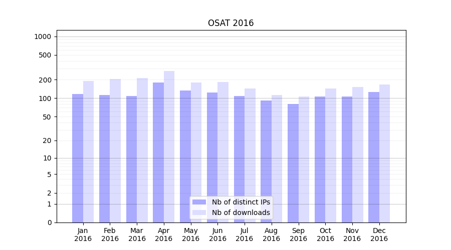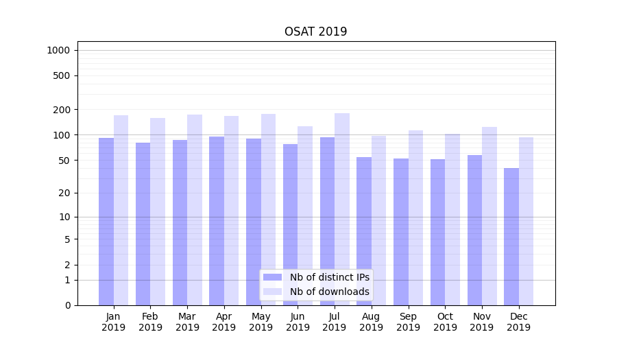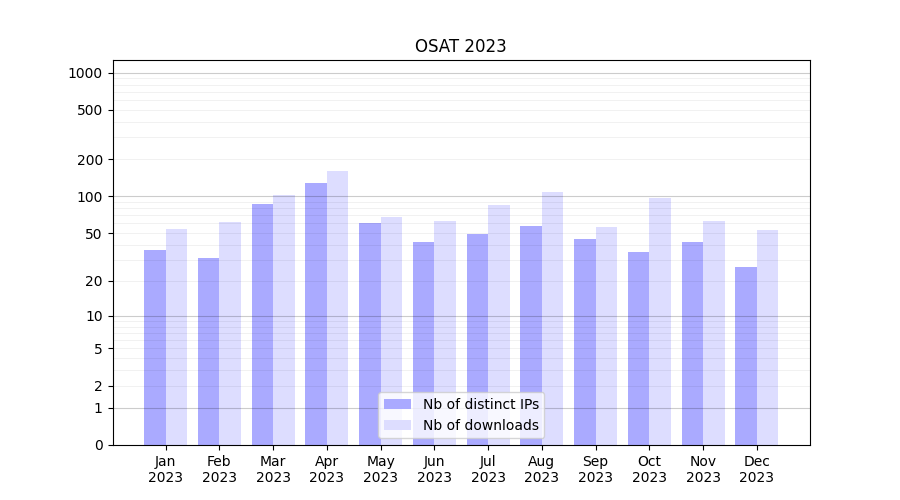 Number of downloads for software package OSAT, year by year, from 2025 back to 2014 (years with no downloads are omitted):