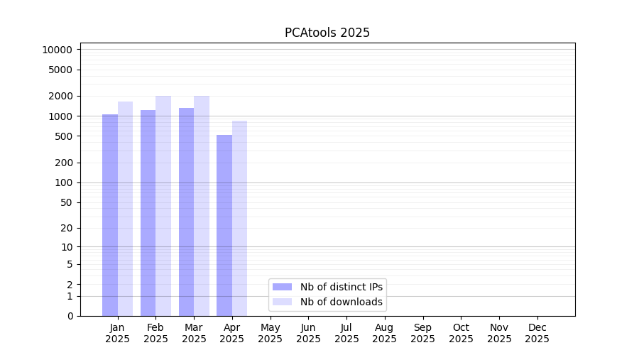 Number of downloads for software package PCAtools, year by year, from 2025 back to 2014 (years with no downloads are omitted):