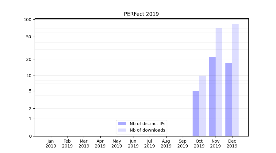 Number of downloads for software package PERFect, year by year, from 2025 back to 2014 (years with no downloads are omitted):