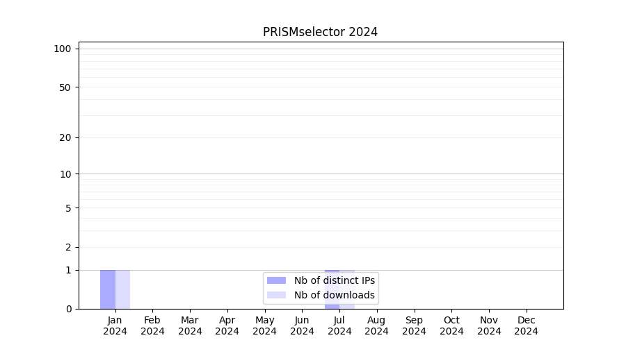 Number of downloads for software package PRISMselector, year by year, from 2025 back to 2014 (years with no downloads are omitted):