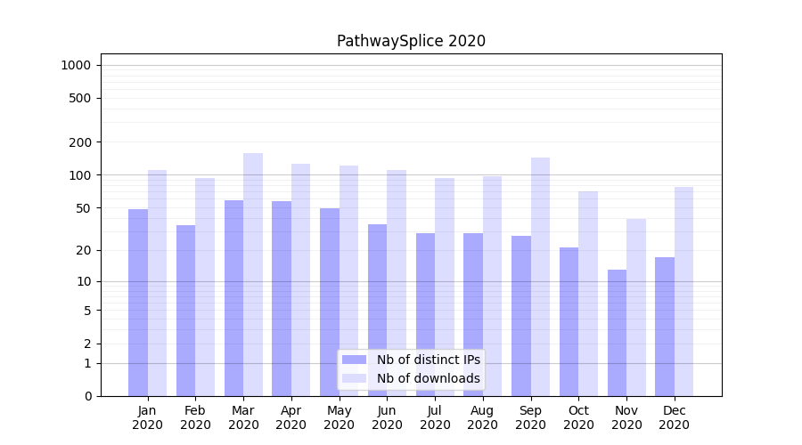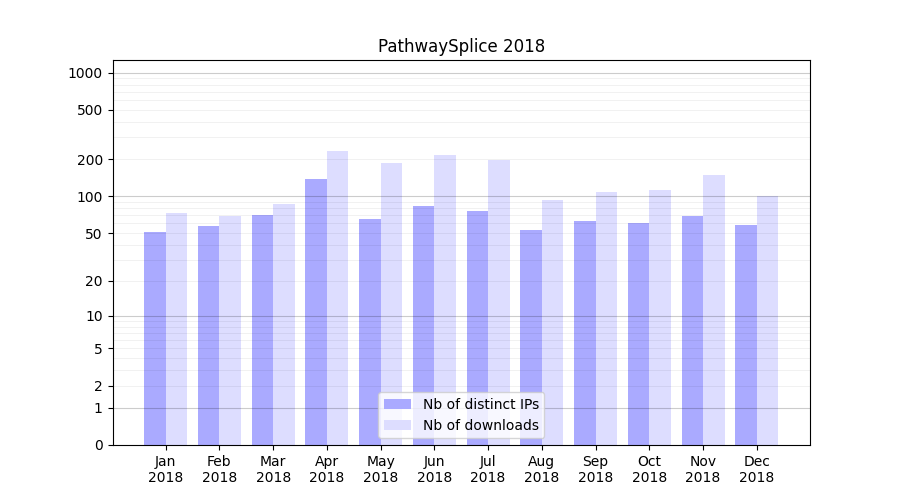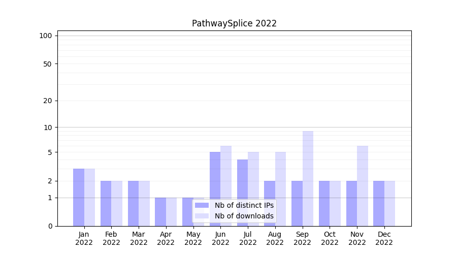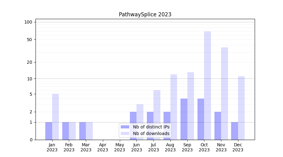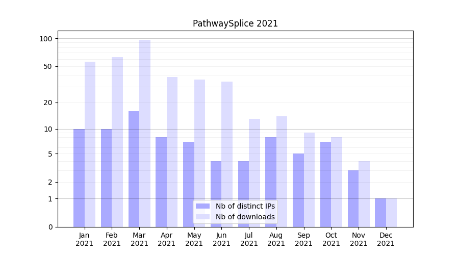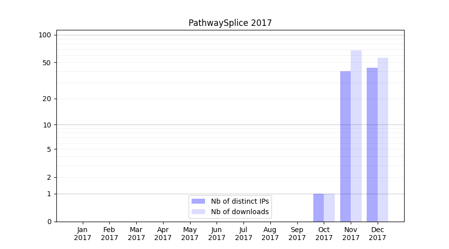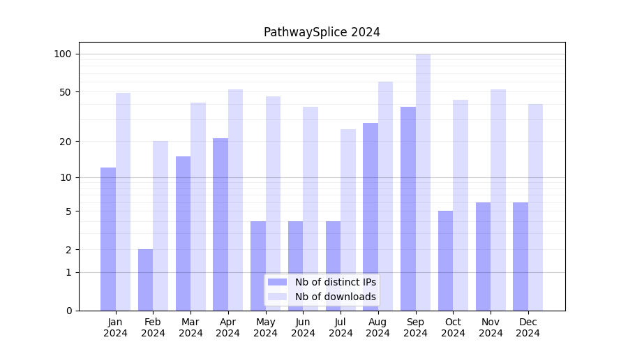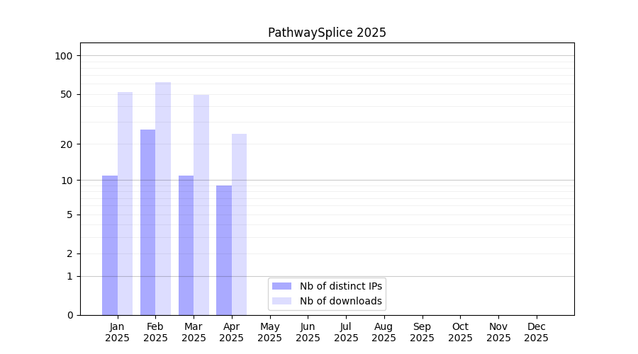 Number of downloads for software package PathwaySplice, year by year, from 2025 back to 2014 (years with no downloads are omitted):