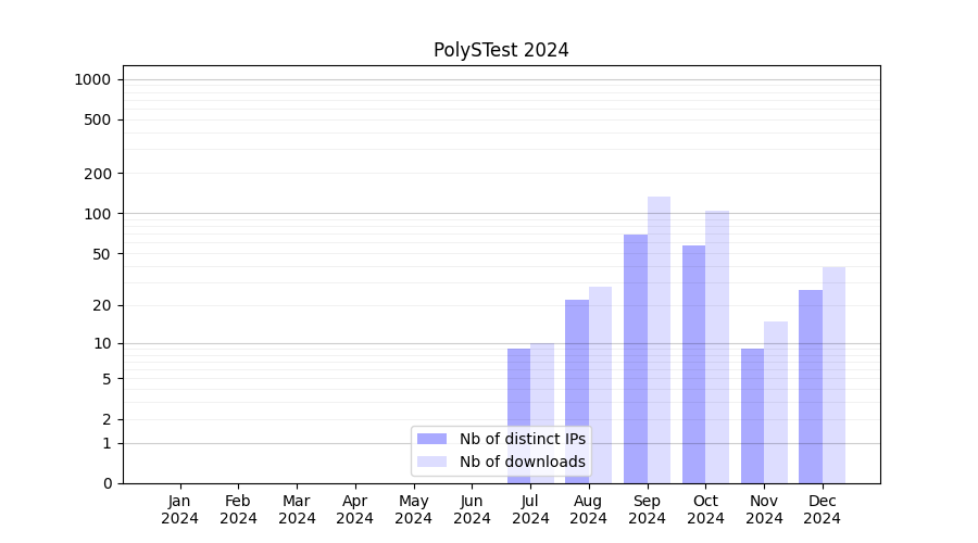 Number of downloads for software package PolySTest, year by year, from 2025 back to 2014 (years with no downloads are omitted):