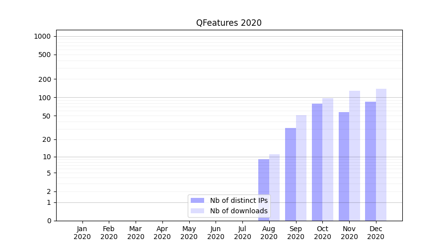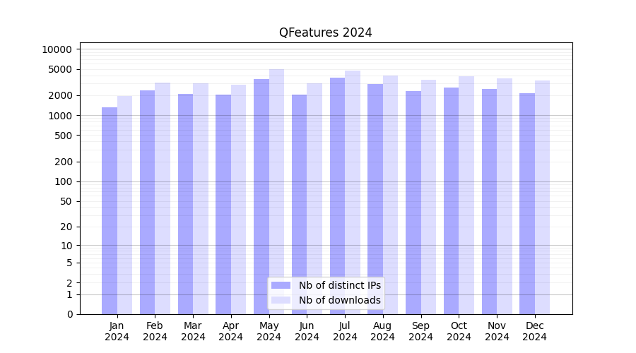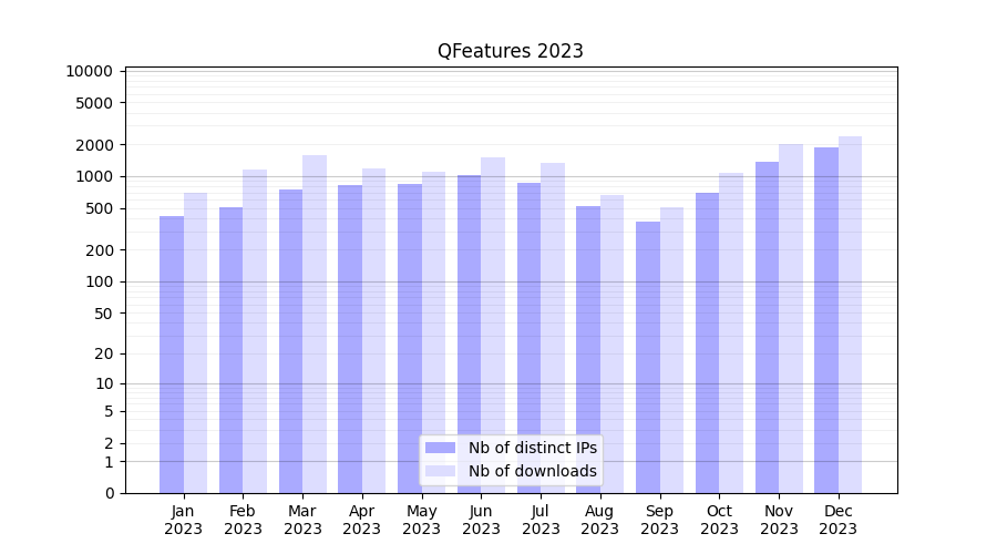 Number of downloads for software package QFeatures, year by year, from 2025 back to 2014 (years with no downloads are omitted):