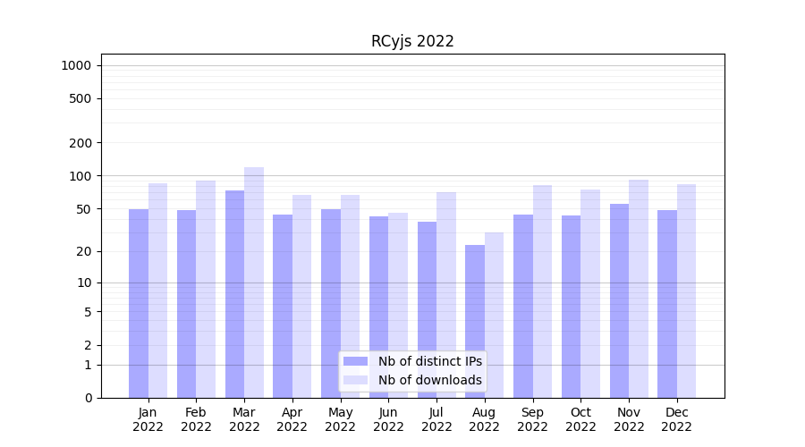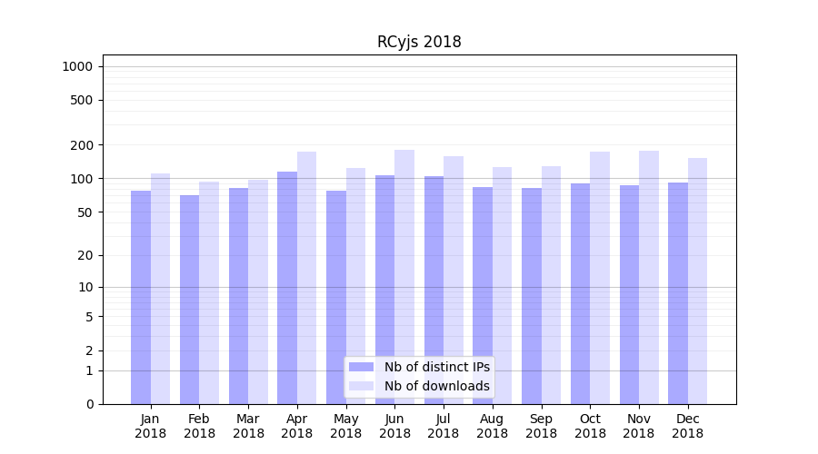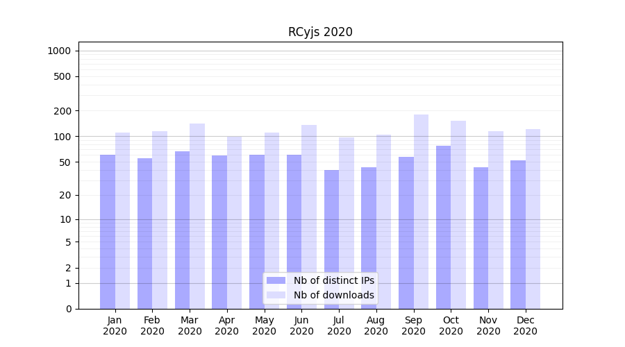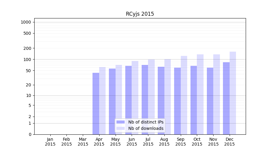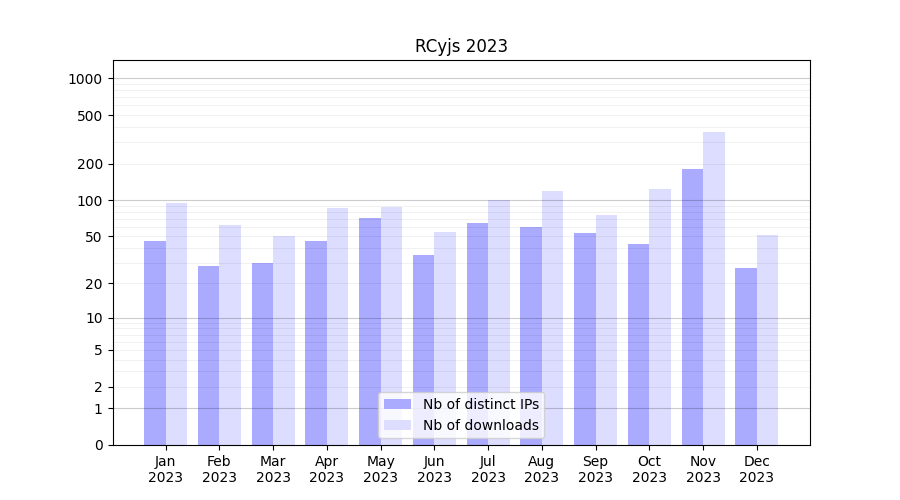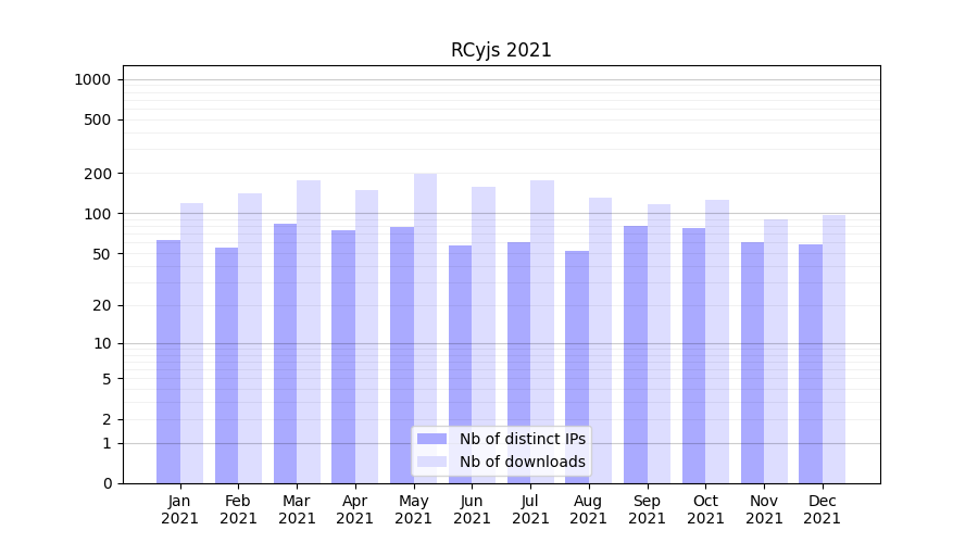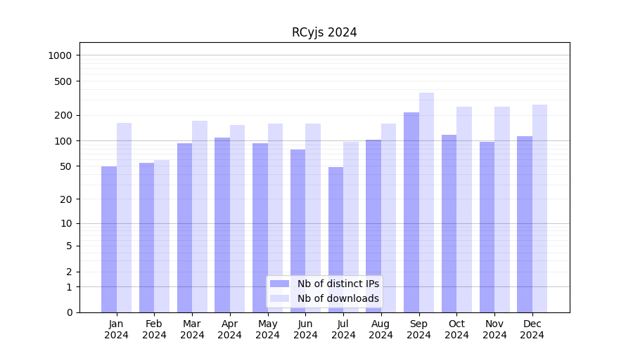 Number of downloads for software package RCyjs, year by year, from 2025 back to 2014 (years with no downloads are omitted):