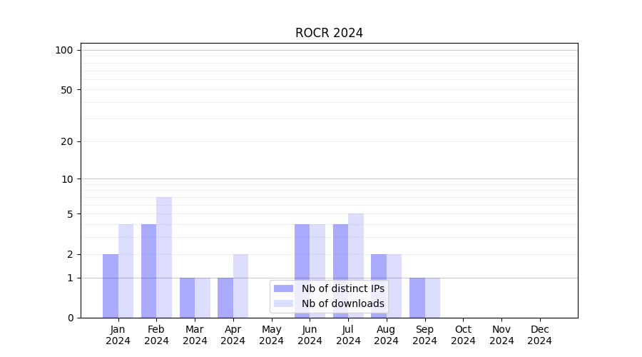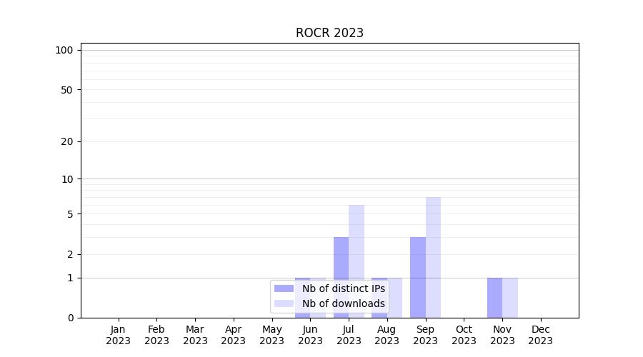 Number of downloads for software package ROCR, year by year, from 2025 back to 2014 (years with no downloads are omitted):