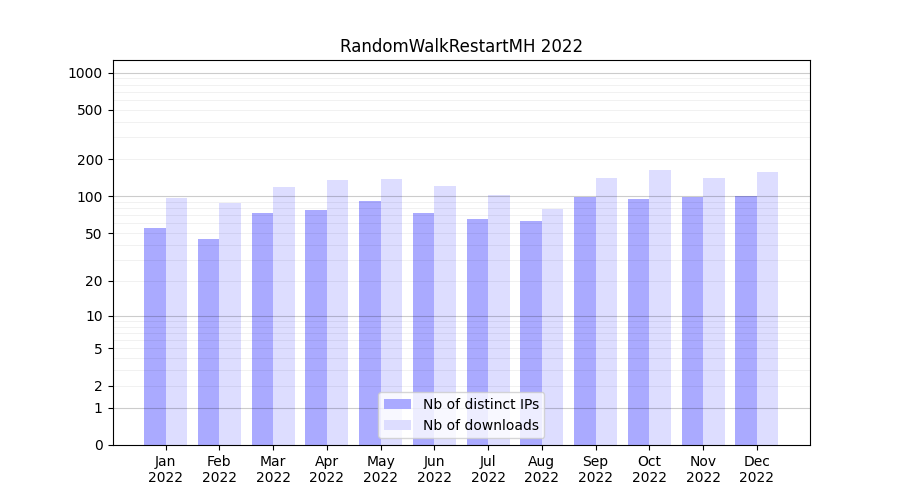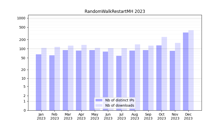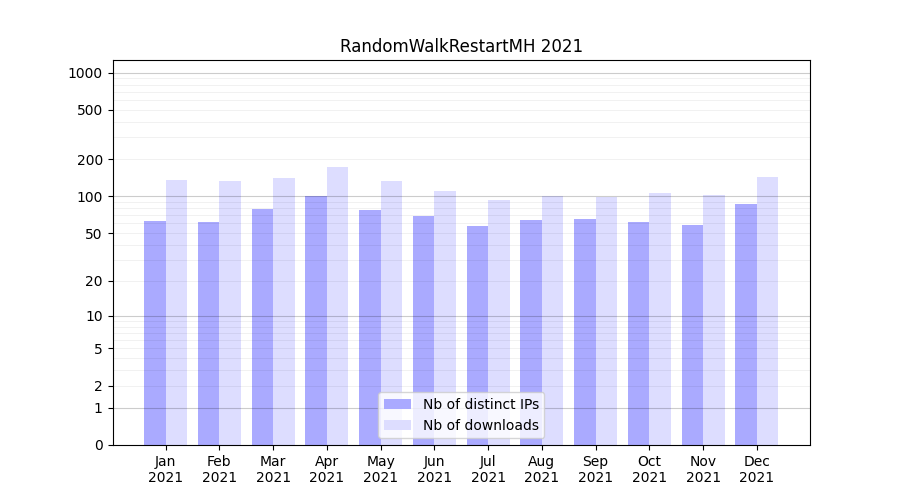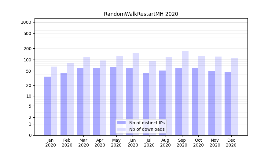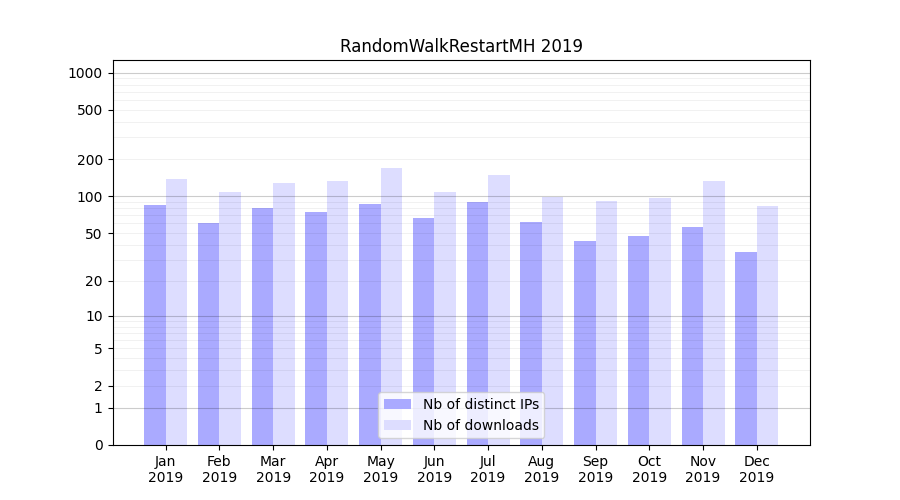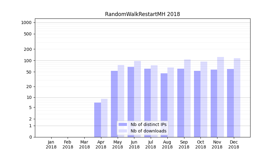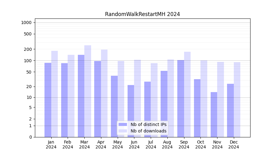 Number of downloads for software package RandomWalkRestartMH, year by year, from 2025 back to 2014 (years with no downloads are omitted):
