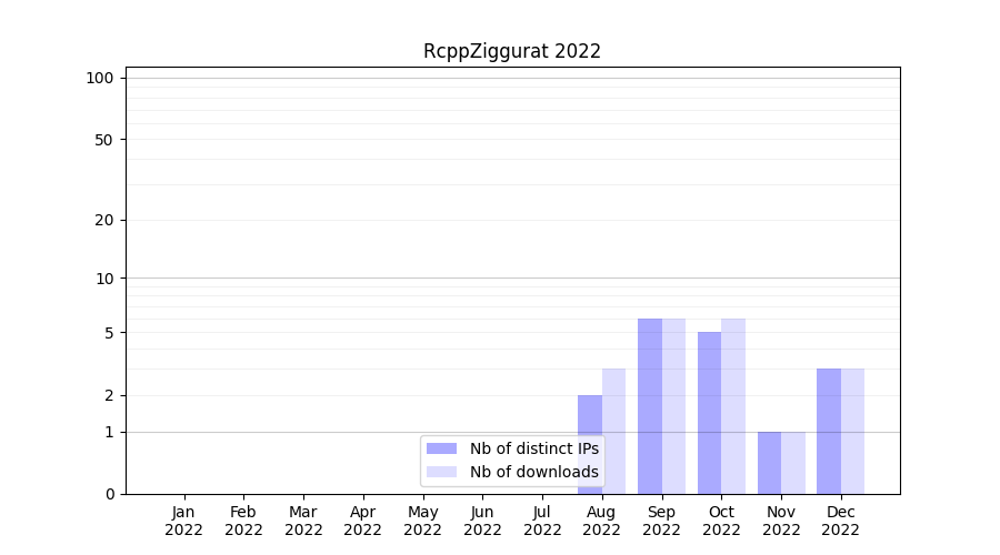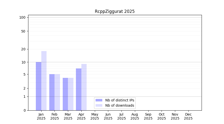 Number of downloads for software package RcppZiggurat, year by year, from 2025 back to 2014 (years with no downloads are omitted):
