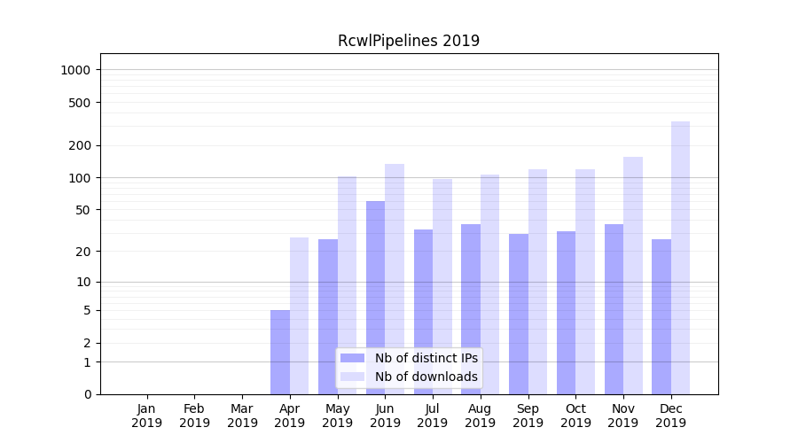 Number of downloads for software package RcwlPipelines, year by year, from 2025 back to 2014 (years with no downloads are omitted):