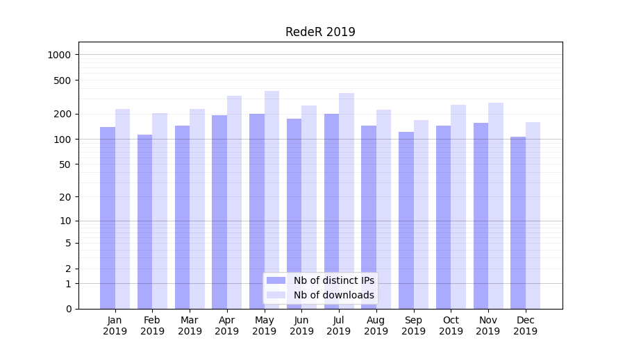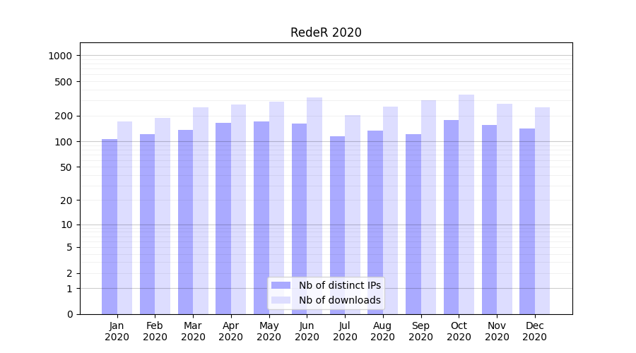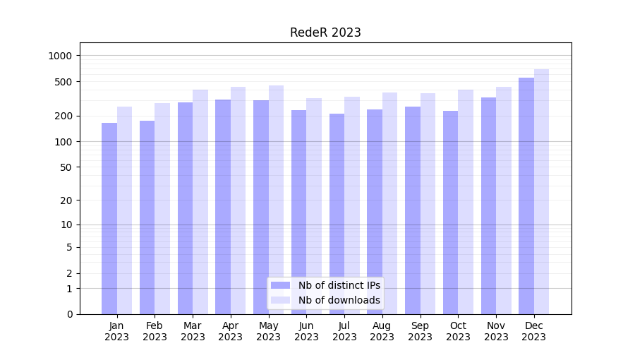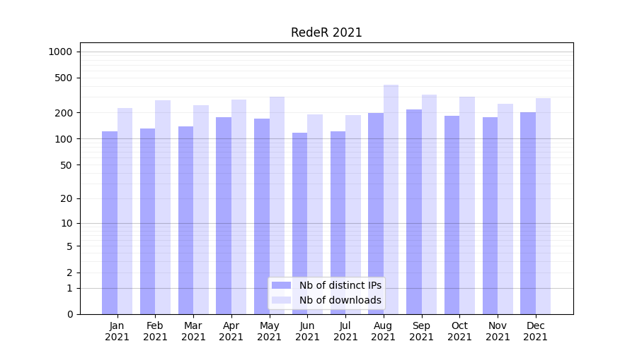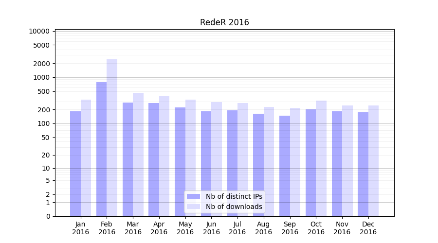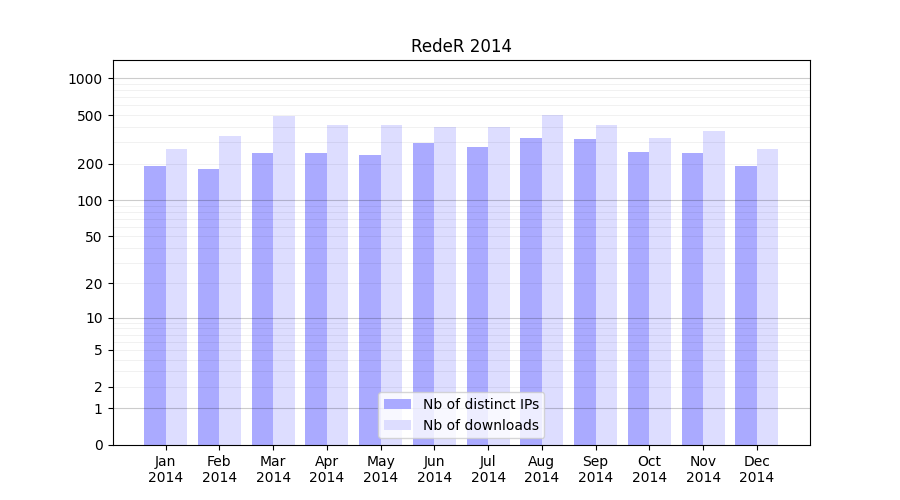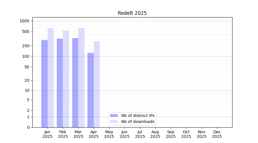 Number of downloads for software package RedeR, year by year, from 2025 back to 2014 (years with no downloads are omitted):