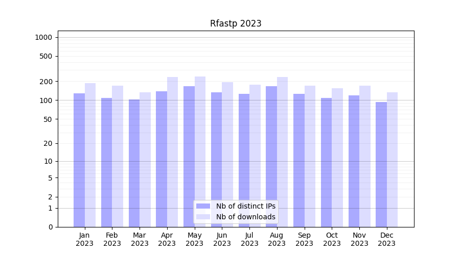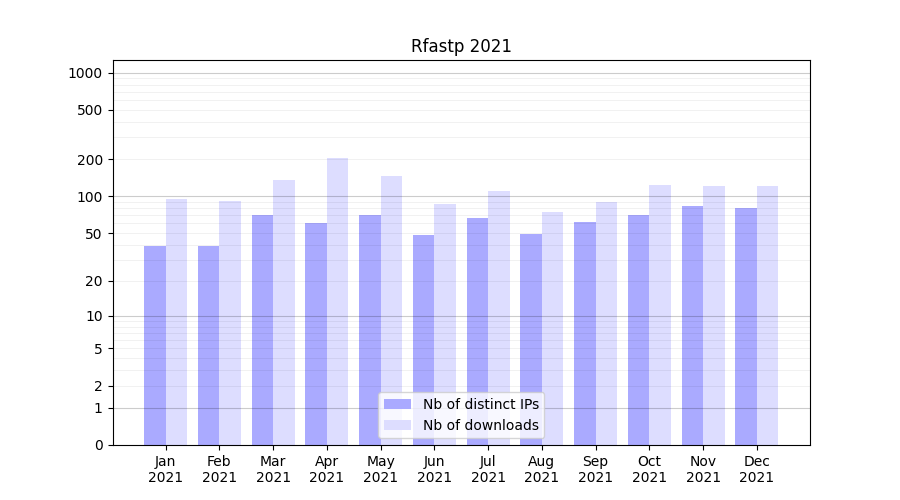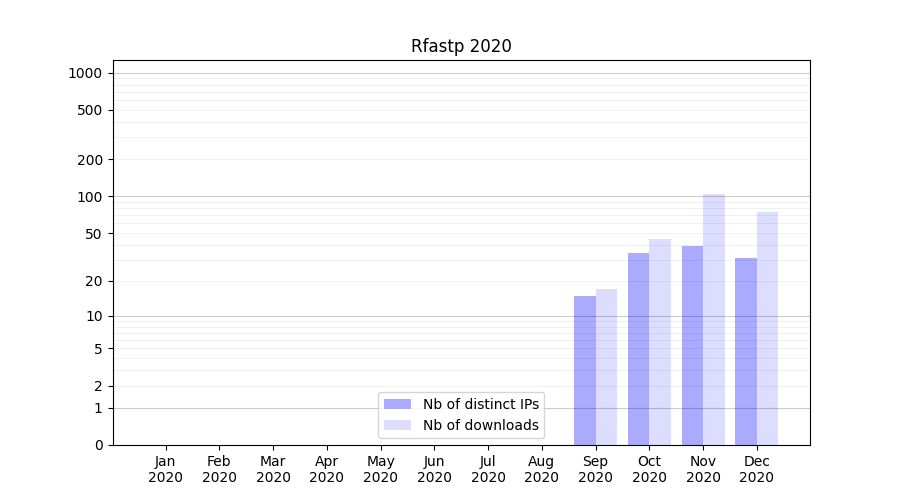Number of downloads for software package Rfastp, year by year, from 2025 back to 2014 (years with no downloads are omitted):