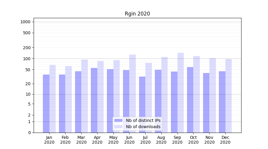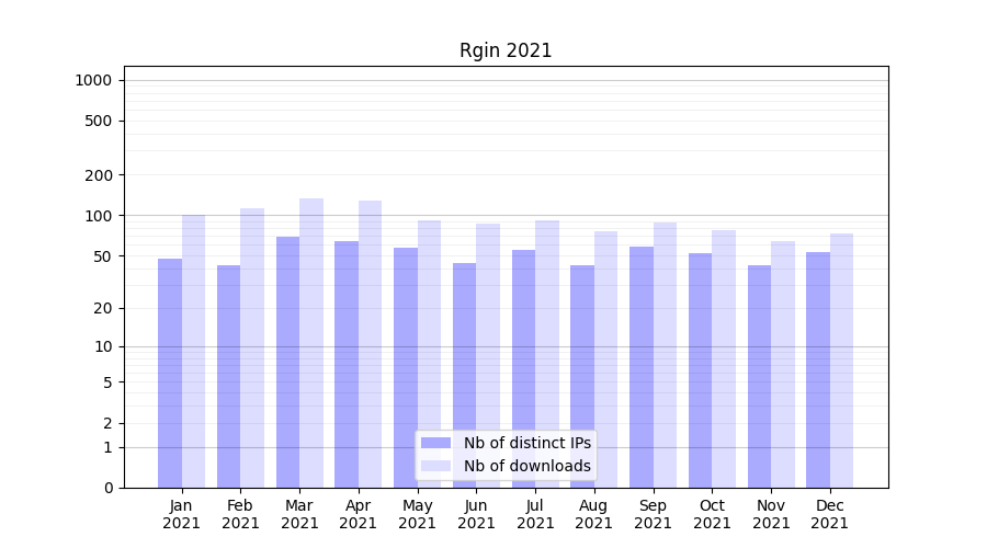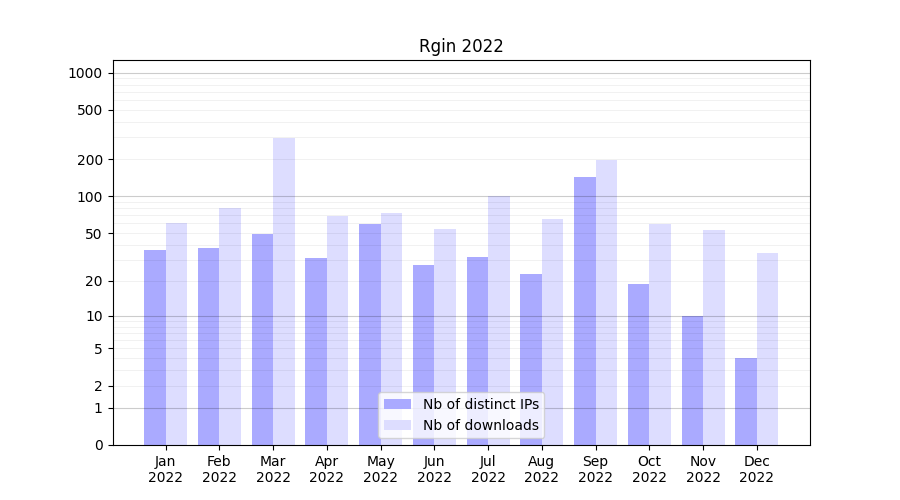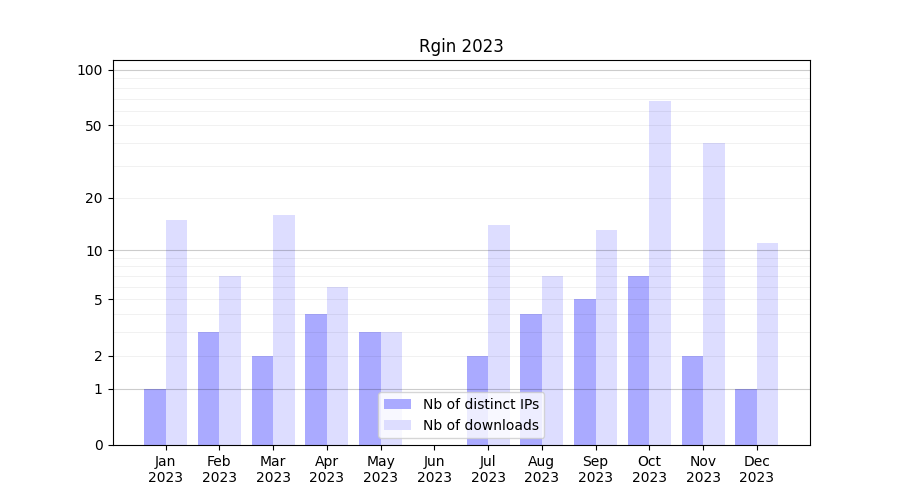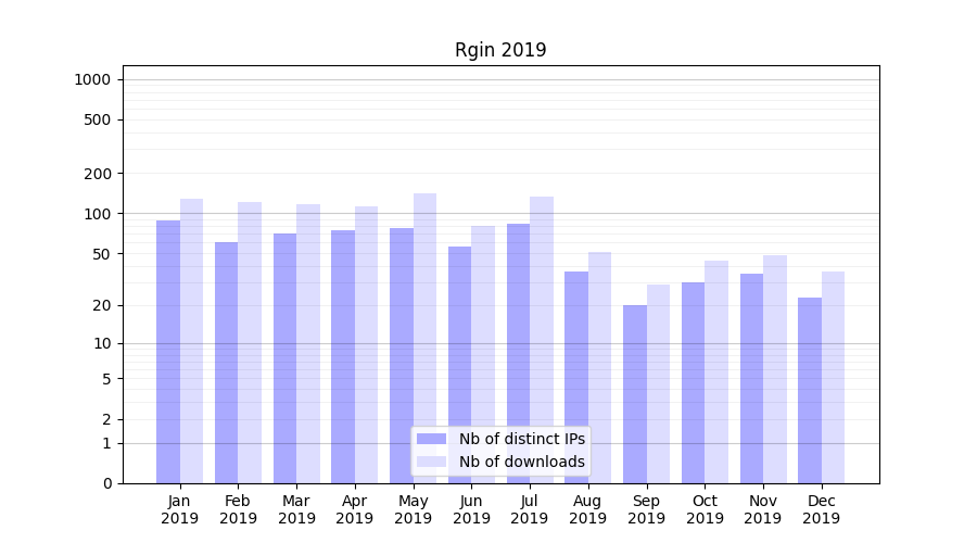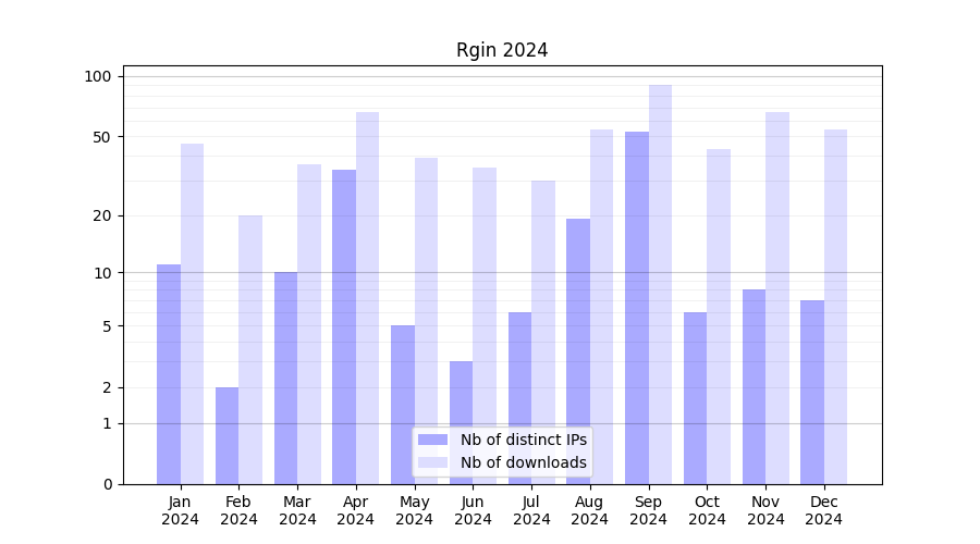 Number of downloads for software package Rgin, year by year, from 2025 back to 2014 (years with no downloads are omitted):