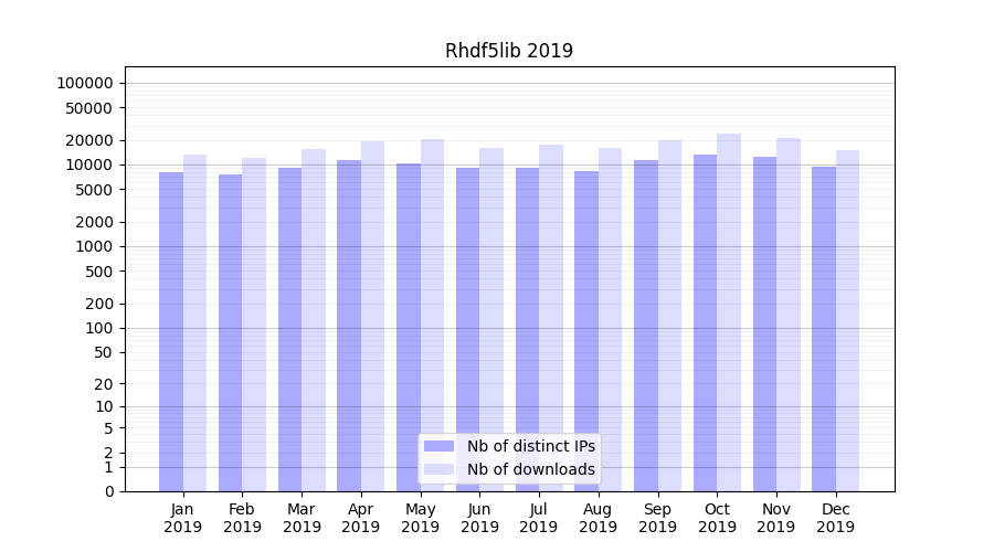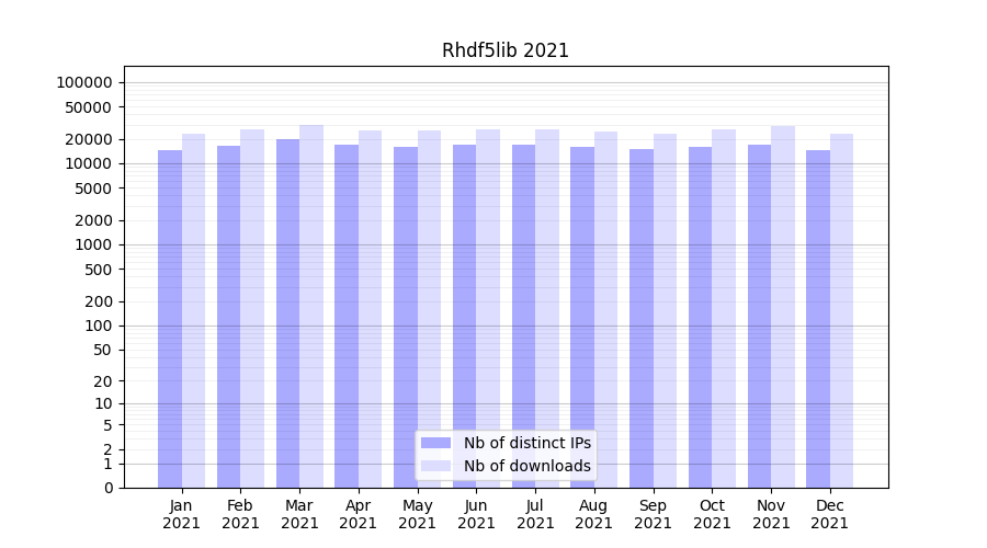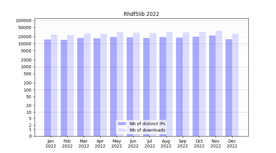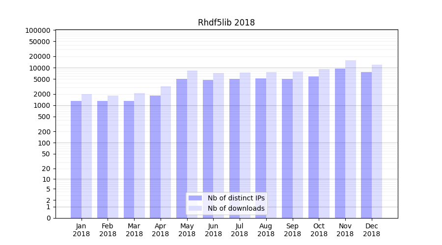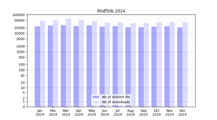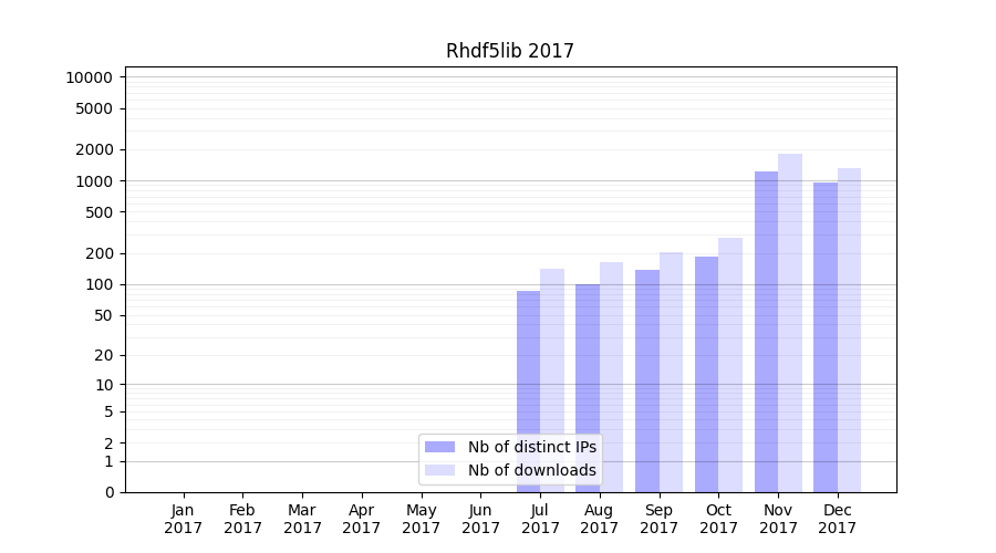 Number of downloads for software package Rhdf5lib, year by year, from 2025 back to 2014 (years with no downloads are omitted):