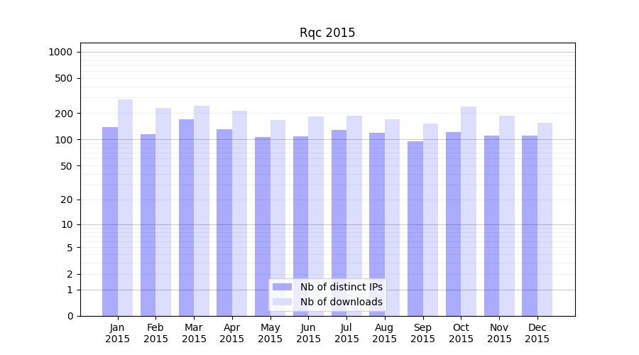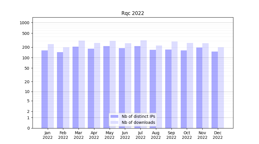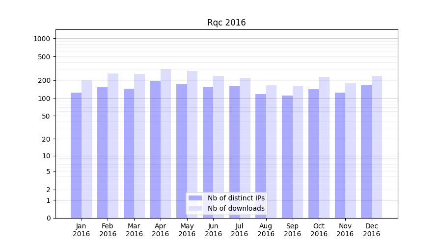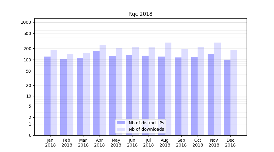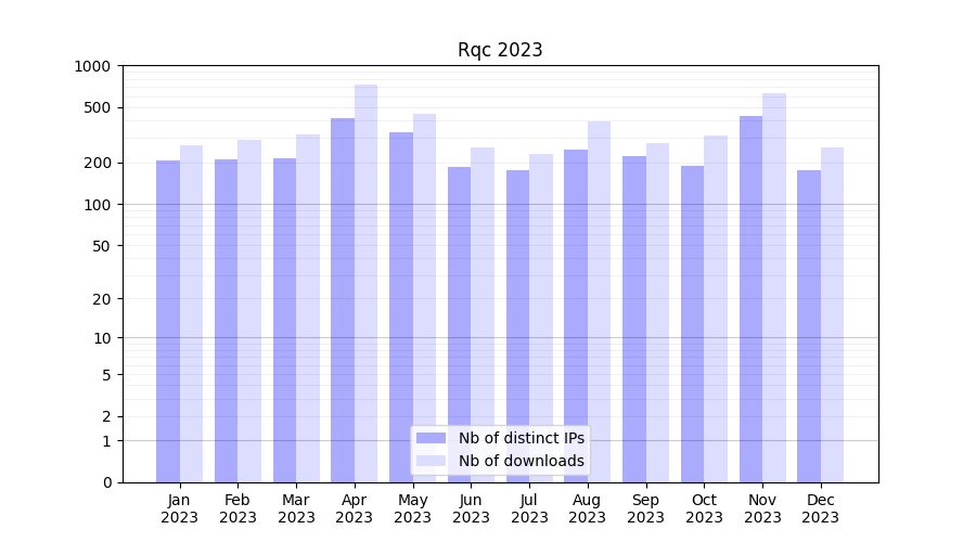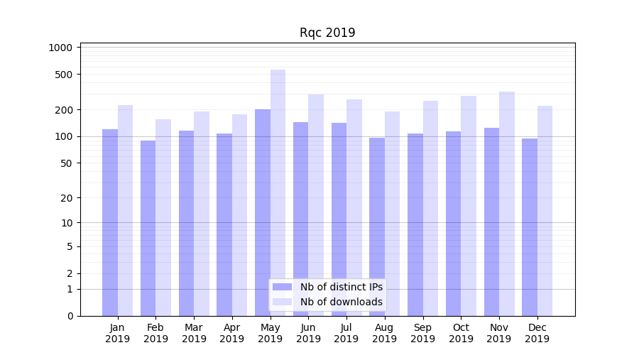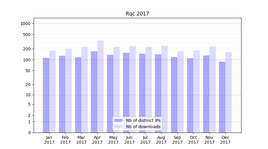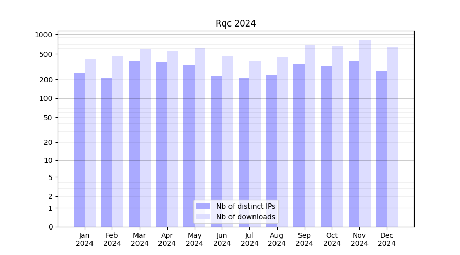 Number of downloads for software package Rqc, year by year, from 2025 back to 2014 (years with no downloads are omitted):