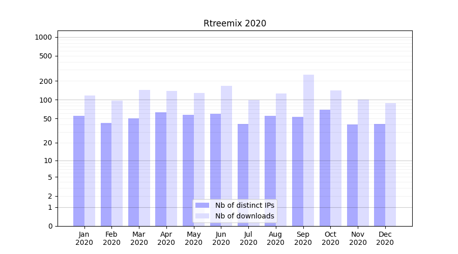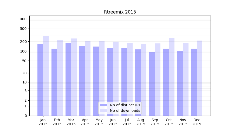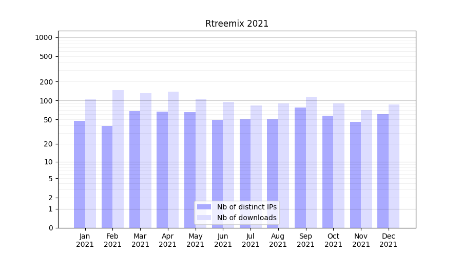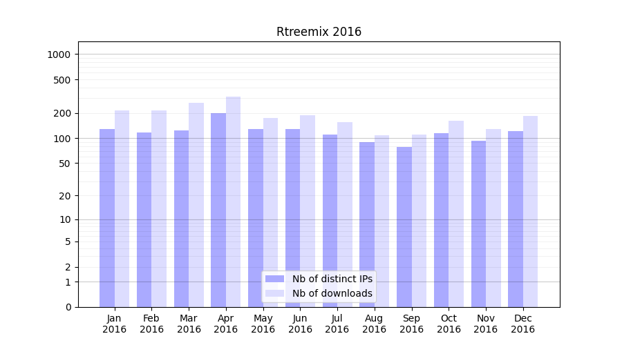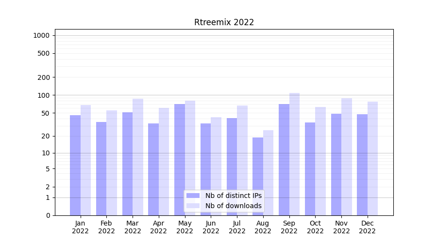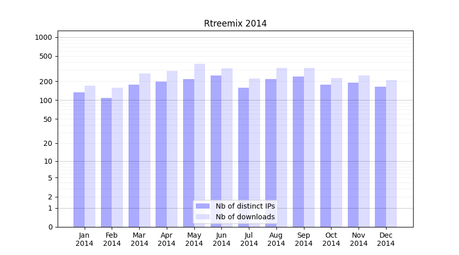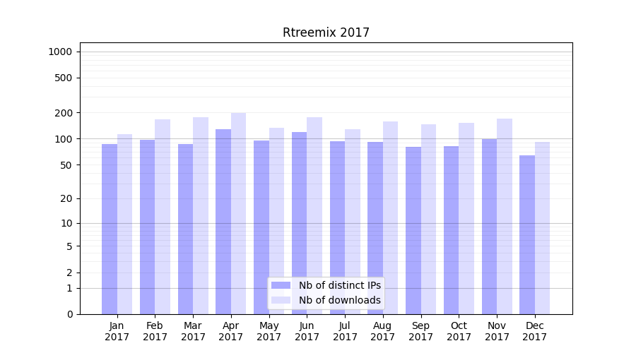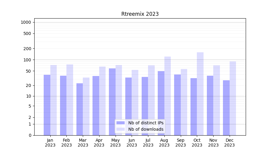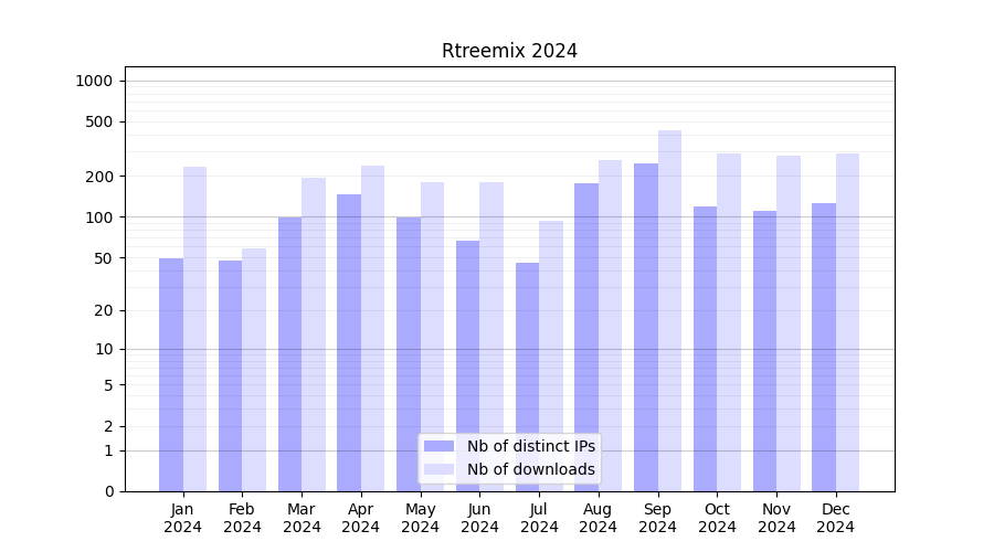 Number of downloads for software package Rtreemix, year by year, from 2025 back to 2014 (years with no downloads are omitted):